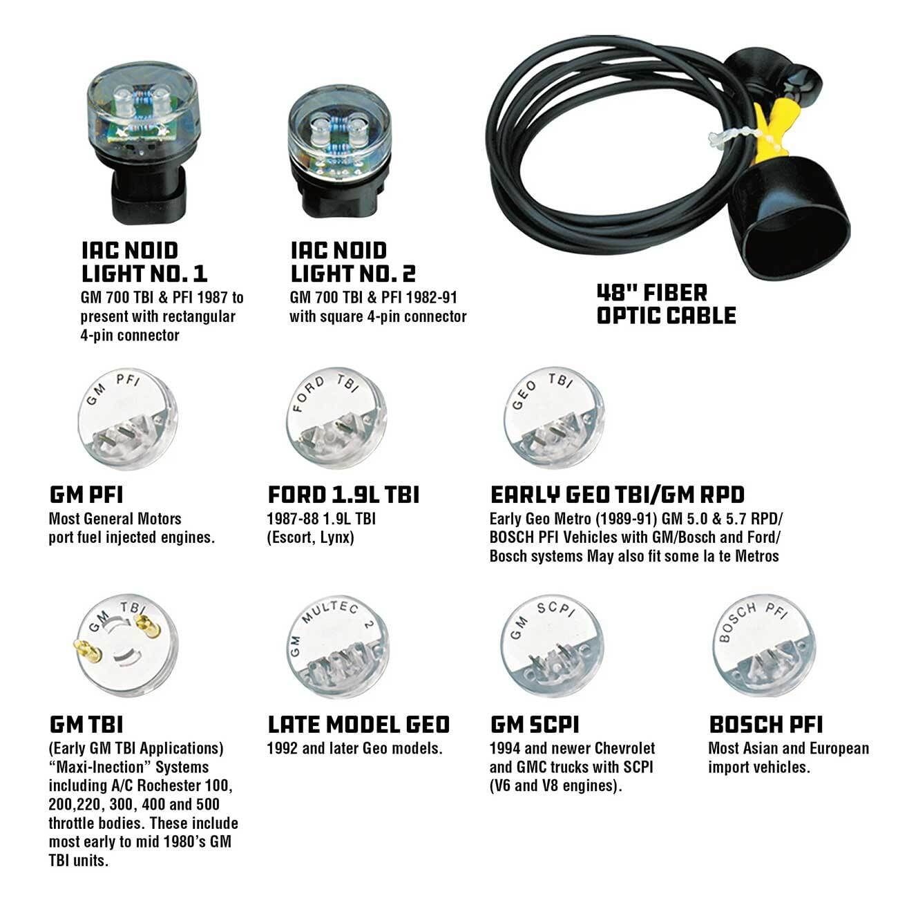 ? KIT INCLUDES: 8 fuel injection test (Noid) lights; 2 Idle Air Control Valve test lights; 48-inch fiber optic cable extension for maximum visibility