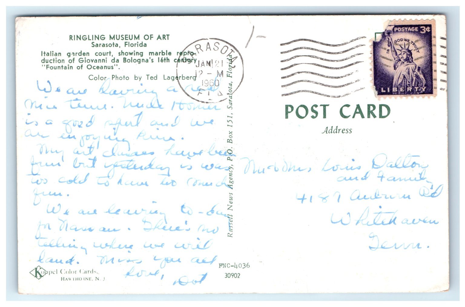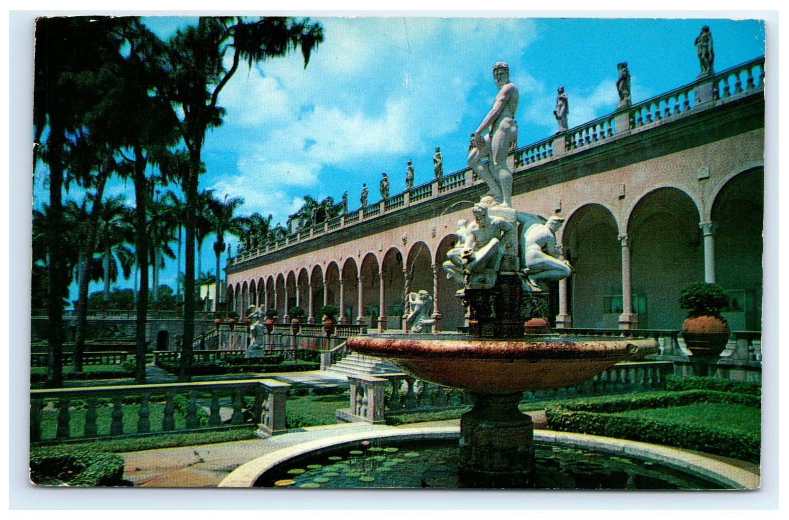 This vintage postcard features a vibrant color lithograph image of the Italian Garden Court at the Ringling Museum of Art in Sarasota, Florida. The focal point is the striking marble reproduction of Giovanni da Bologna's 16th century "Fountain of Oceanus," surrounded by lush greenery and classical statues atop the museum's colonnade. The bright blue sky and palm trees add a tropical Floridian charm to this picturesque scene.