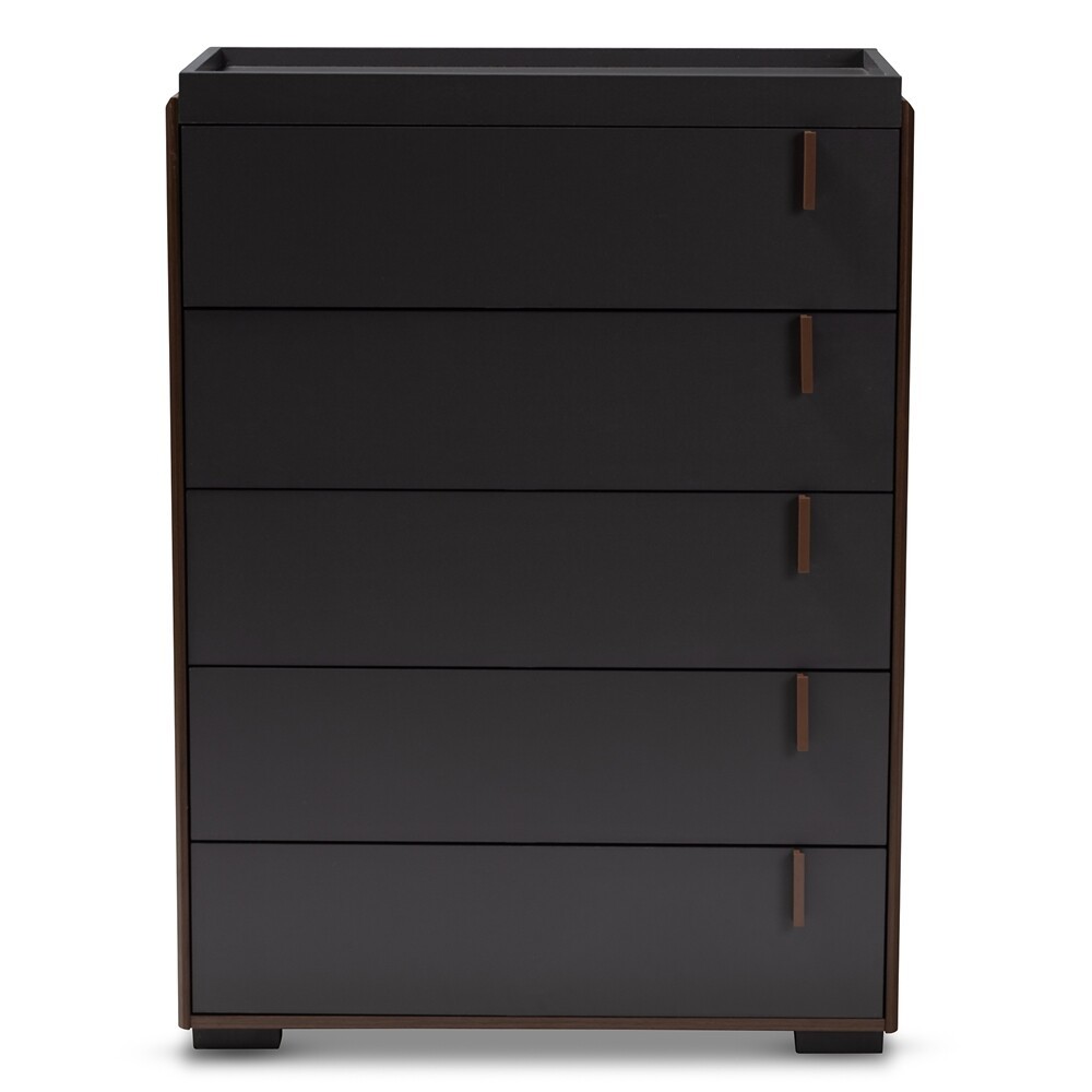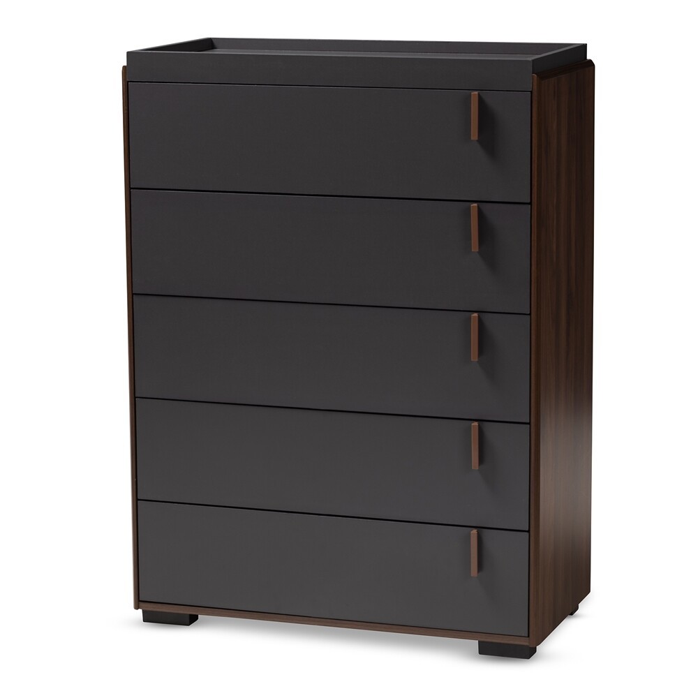 Keep your bedside organized with this nightstand, chest, or dresser. Constructed from solid particle board, this collection showcases a two-tone grey and walnut brown finish for a cool, contemporary feel. The nightstand features one spacious drawer and one shelf provide room to store bedside essentials. The 5-drawer chest features five spacious drawers and the 6-drawer dresser features six spacious drawers provide room to store clothes, linens, and more!
