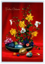 This charming vintage postcard features a vibrant Easter-themed lithograph printed in Western Germany. The front showcases a beautifully arranged bouquet of yellow daffodils, white narcissus flowers, and green ivy on a rich red background, complemented by a decorative bowl of colorful Easter eggs, including a gold foil-wrapped egg and a pink ribbon accent. The greeting "Frohe Ostern" (Happy Easter) is elegantly inscribed in gold text, adding a festive touch.
