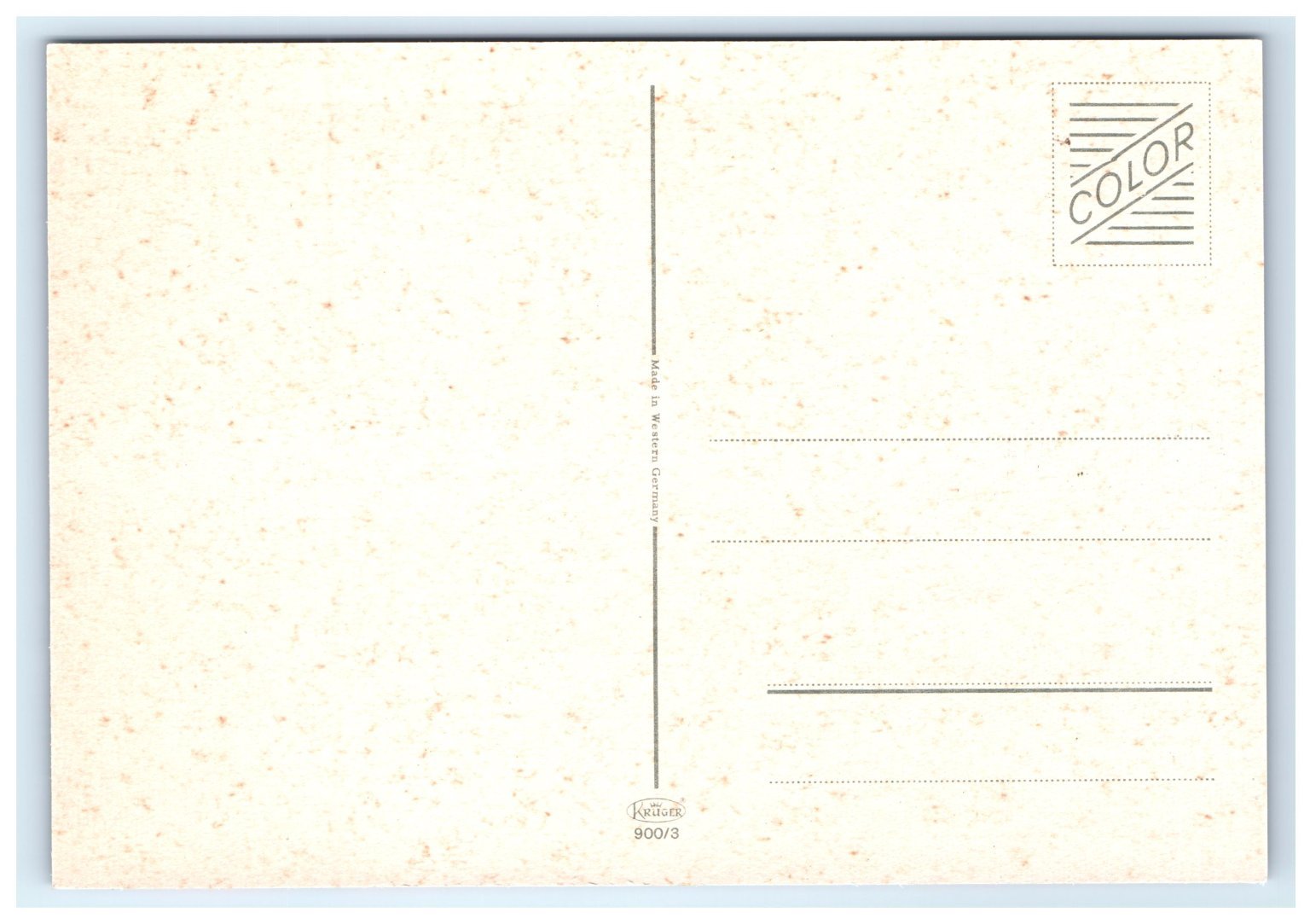 Produced by Krรผger, a noted German publisher, this postcard is marked "900/3" and printed in color using lithographic techniques, popular in mid-20th century postcard production. The back is unposted, preserving its pristine condition for collectors. Its continental size (6 x 4 inches) makes it perfect for framing or adding to an Easter or vintage postcard collection. This original German Easter postcard captures the spirit and artistry of traditional European holiday greetings, making it a delightful collectible for seasonal or international postcard enthusiasts.