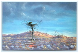 This original lithograph postcard features a stunning depiction of a wedge-tail eagle perched on a nest atop a barren tree in the rugged Broken Hill area of Australia. Created by renowned Australian artist Jack Absalom, the artwork beautifully captures the harsh yet captivating outback landscape with its vivid colors and detailed brushwork, showcasing the native flora and expansive sky. The postcard measures a Continental size of 6 x 4 inches, ideal for collectors and enthusiasts of Australian wildlife and landscapes.