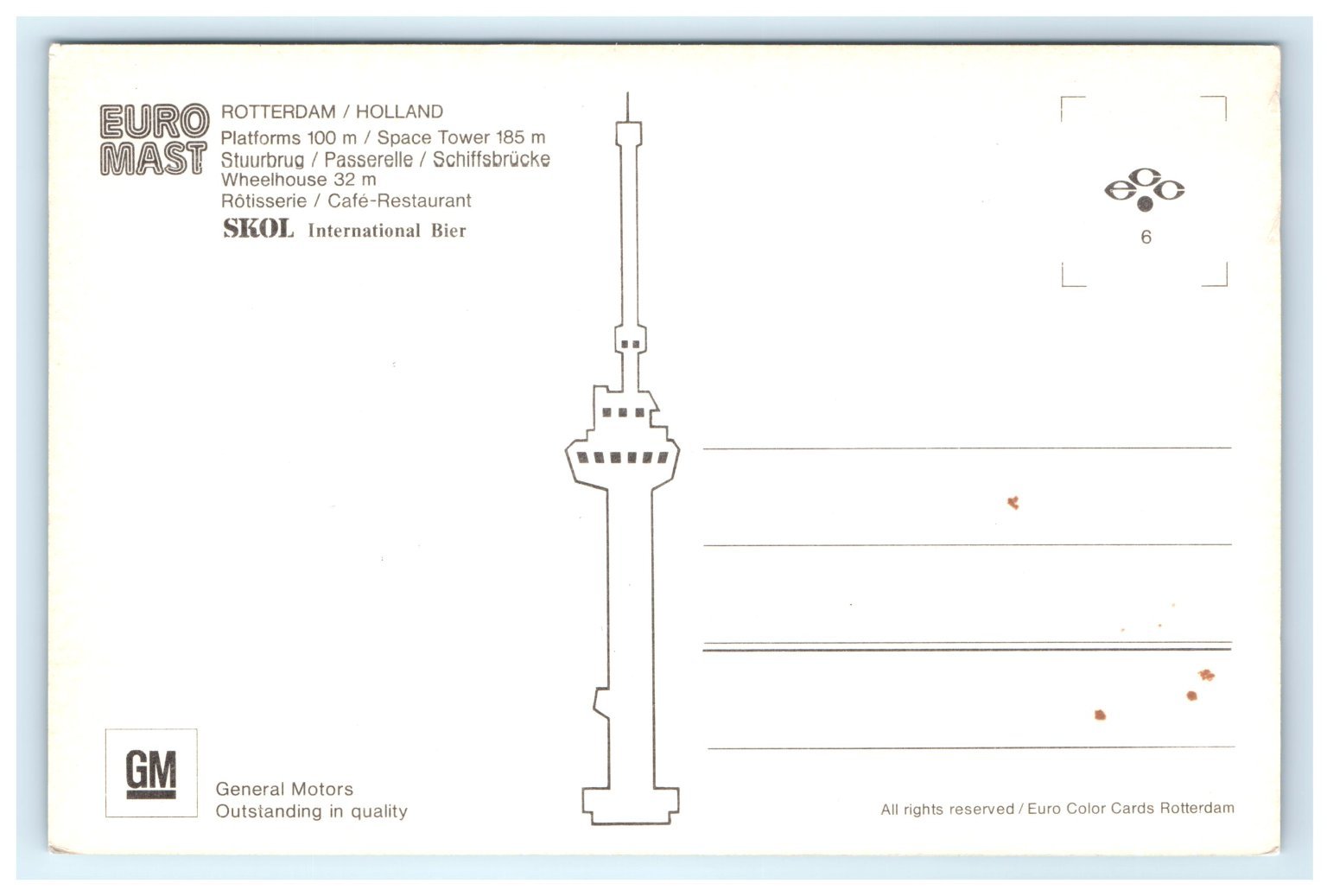 Produced by Euro Color Cards Rotterdam, the postcard showcases detailed printing quality typical of mid-20th century lithograph techniques. It includes a stylized drawing of the Euromast Tower on the reverse side, with descriptive text noting key features such as the platforms at 100 meters, the cafe-restaurant, and the space tower height. This collectible postcard also bears logos for General Motors and SKOL International Bier, adding to its period charm and advertising value. A must-have for collectors of European landmarks or maritime history memorabilia.