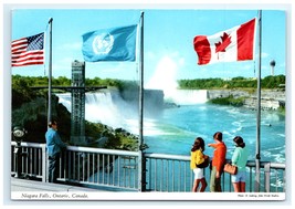 This vibrant vintage lithograph postcard captures a stunning view of Niagara Falls, Ontario, Canada, taken from the Rainbow Bridge. The image prominently features the iconic Canadian Horseshoe Falls and the American Falls in the background, with mist rising dramatically from the cascading waters. Three flags-the United States, United Nations, and Canada-wave proudly along the bridge, symbolizing the unique international boundary that the bridge represents. Visitors can be seen admiring the breathtaking scene, adding a nostalgic mid-20th century charm to the postcard.