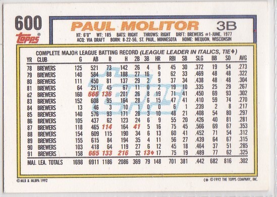 M) 1992 Topps Baseball Trading Card - Paul Molitor #600