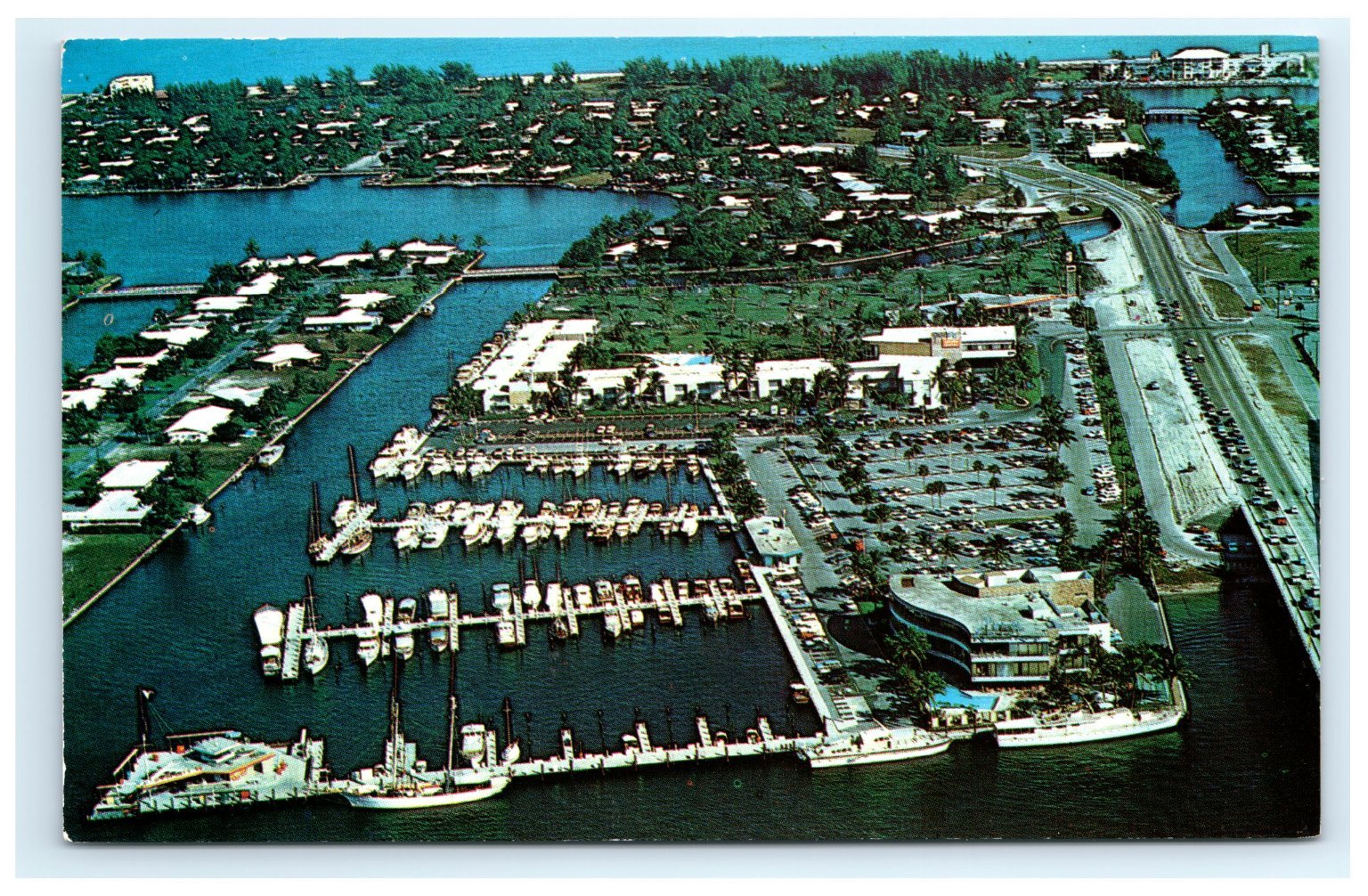 Printed as a chrome postcard using lithographic techniques, this original piece was published by Gil Sayward Assoc., Inc. of Fort Lauderdale. The postcard measures a standard 5.5 x 3.5 inches and highlights the era's classic travel and resort culture. Its detailed depiction of the marina and surrounding infrastructure offers collectors a glimpse into Florida's coastal leisure history. This collectible postcard is unposted and is an excellent addition for enthusiasts of vintage travel memorabilia, Florida history, or maritime-themed collections.