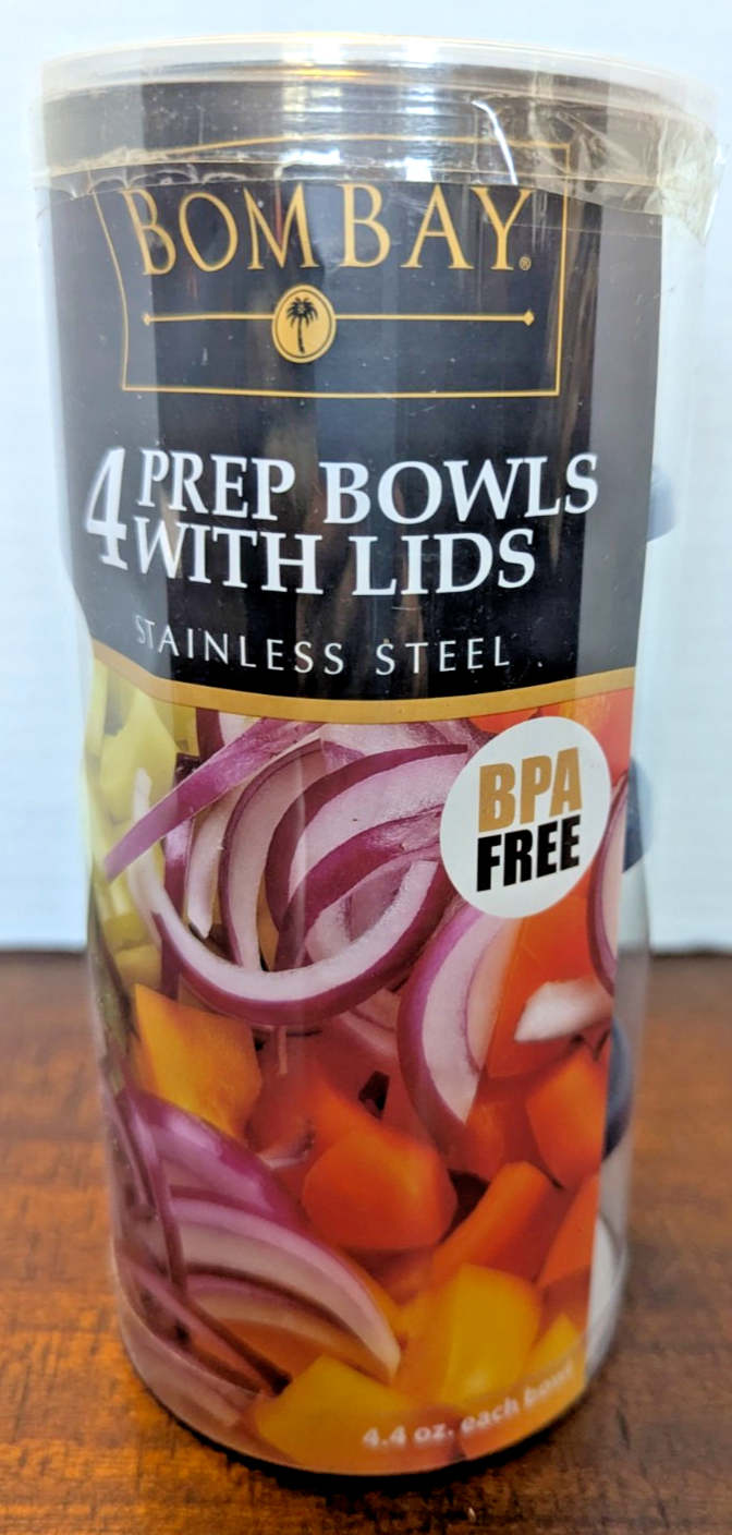 The Bombay Prep Bowls set includes 4 bowls, 3-inch diameter, made of stainless steel and BPA-free plastic lids.
