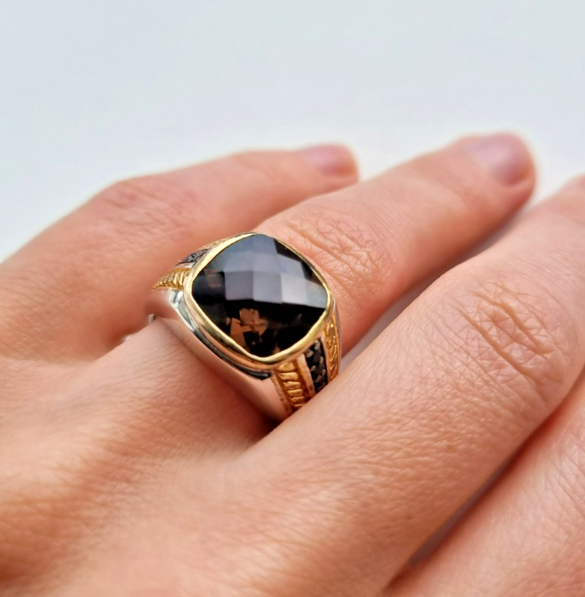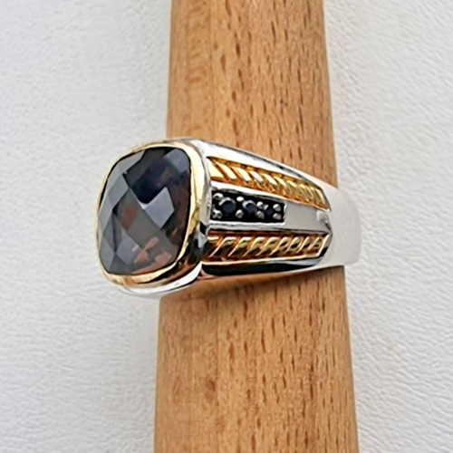 BGE 925 STERLING SILVER SMOKY QUARTZ AND BLACK ONYX GOLD PLATED RING SIZE 8.75