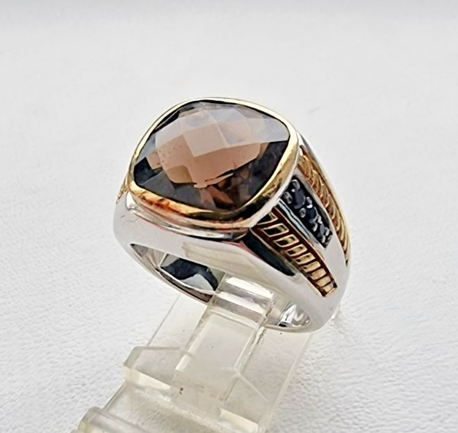 The BGE 925 Sterling Silver Smoky Quartz and Black Onyx Gold Plated Ring is a vintage piece of fine jewelry featuring a natural brown Smoky Quartz stone set in sterling silver. The ring is signed by the reputable brand BGE and has a unique bezel setting style. With a ring size of 8.75, it is resizable and has a band width of 4.5mm. The piece also includes seven additional gemstones, making it a beautiful and elegant statement accessory for any jewelry collection.