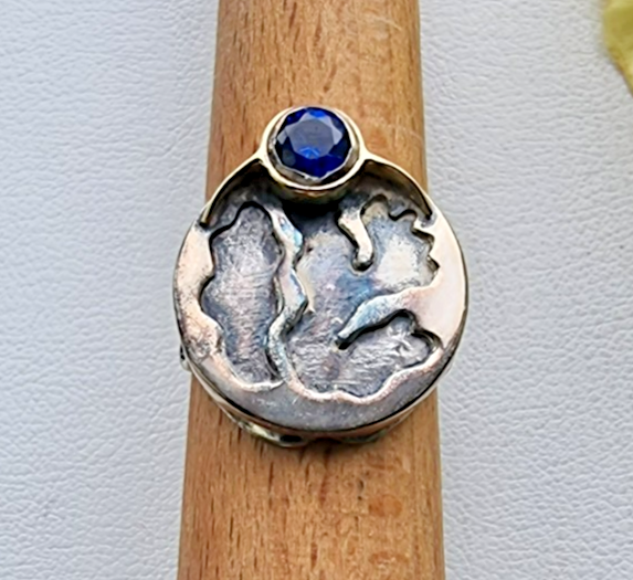 BEAUTIFUL GIFT BOX INCLUDED!!!This vintage rare 14K gold and 925 sterling silver ring features a 5.8mm blue spinel as the main stone in a round shape. The ring is size 7.25 and has a bezel setting style, with a band width of 3mm. The beauty theme of this cocktail ring makes it a stunning piece of fine jewelry, perfect for those looking for a unique and elegant accessory. Made in Israel, this ring combines vintage charm with the luxury of high-quality gemstones and metals.