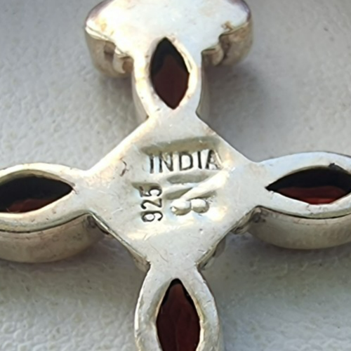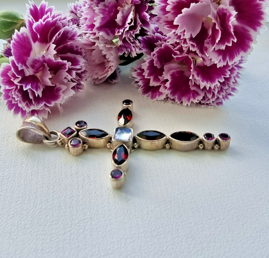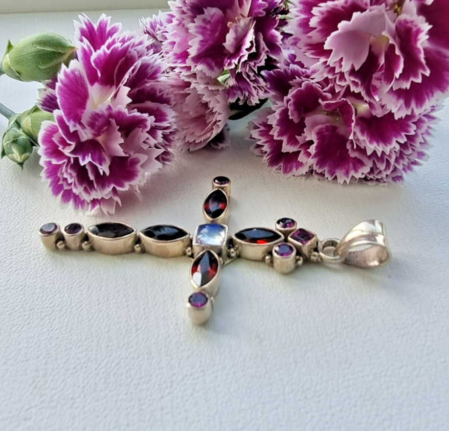 NICKY BUTLER 925 STERLING SILVER GARNET TOURMALINE AND MOONSTONE CROSS PENDANT