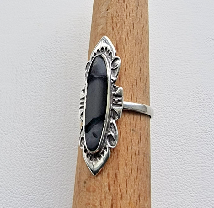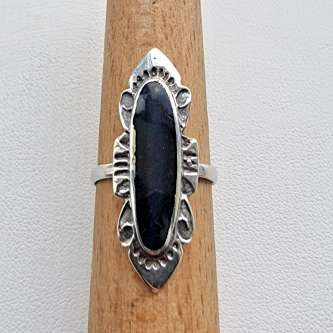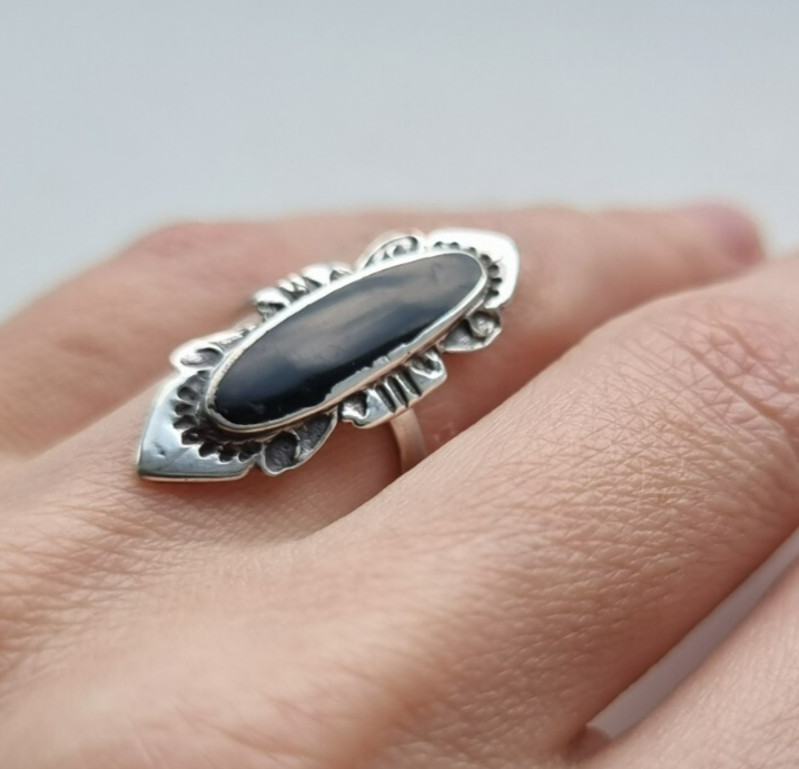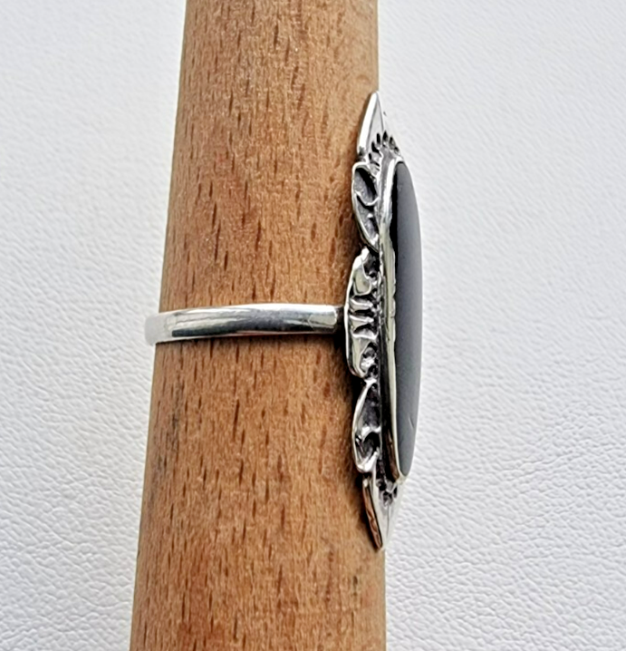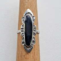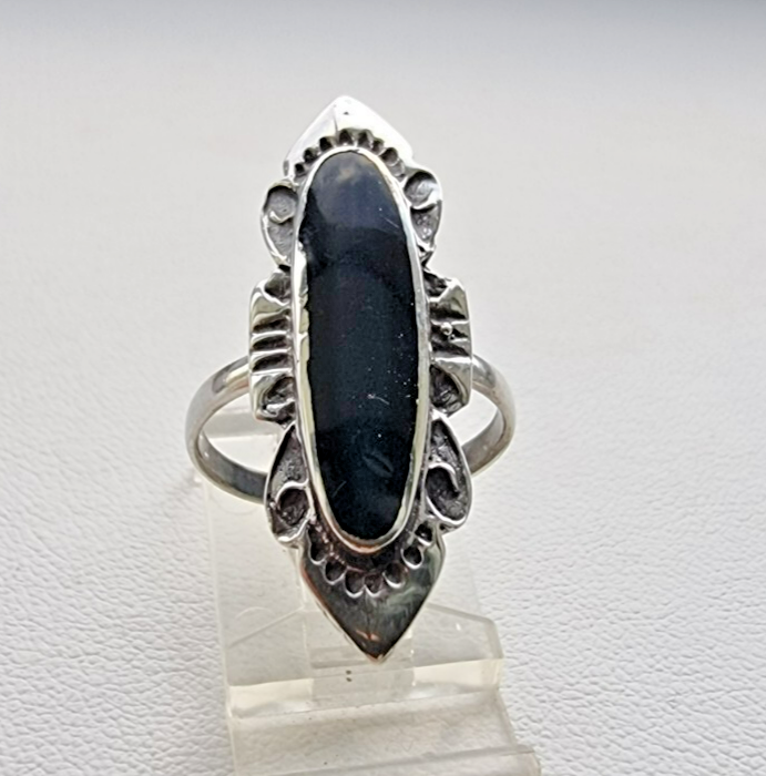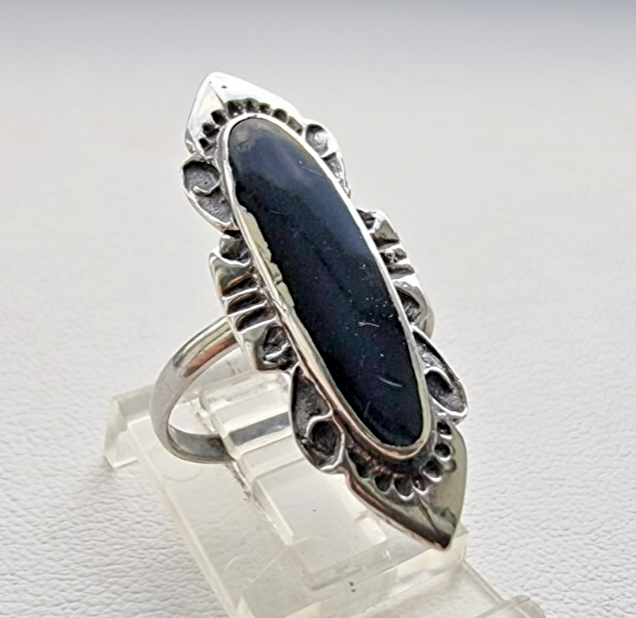 HAN VINTAGE 925 STERLING SILVER LONG OVAL 23X6 mm. BLACK ONYX RING SIZE 6.75