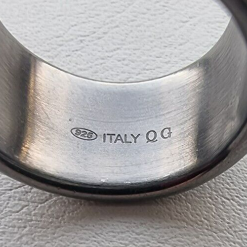 This is a magnificent vintage Italian ring crafted from 925 sterling silver with a black rhodium finish. The wide band measures 12mm in width and is designed in a stylish and timeless band style. The ring is size 6.25 and features a sleek and modern look, perfect for adding a touch of sophistication to any outfit. This piece is from the brand QG and was made in Italy, showcasing quality craftsmanship and design.