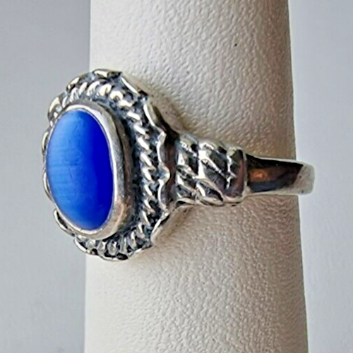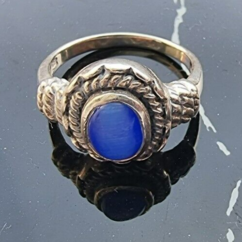 This beautiful ring is crafted from 925 sterling silver and features a stunning natural lapis lazuli cabochon stone set in a bezel setting. The ring is signed and is a vintage piece, perfect for those who appreciate unique and timeless jewelry. The silver color of the metal complements the beautiful blue hue of the stone.