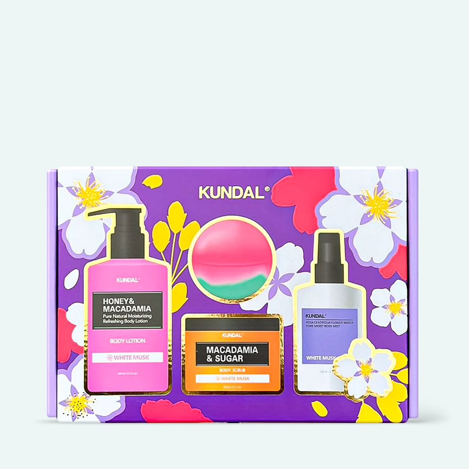 Kundal White Musk Gift Set honey macadamia -body lotion-scrub -mist- bath bomb