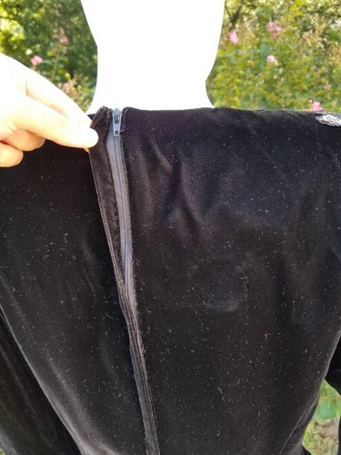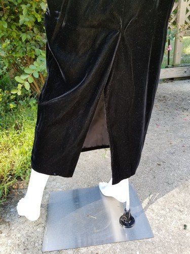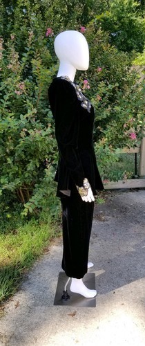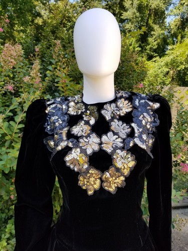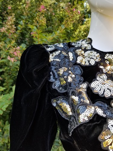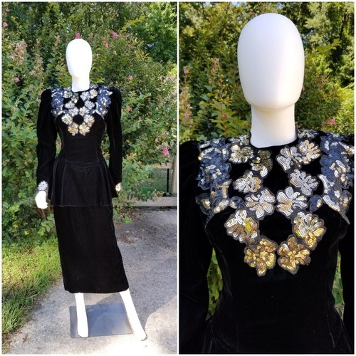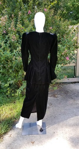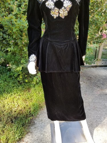 Vintage Does 40s Jessica McClintock Black Velvet Peplum Midi Fitted beaded Dress