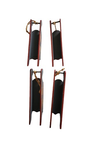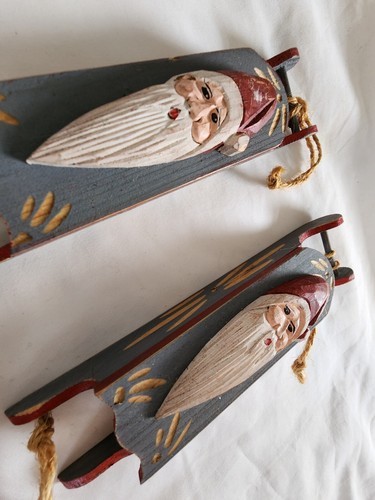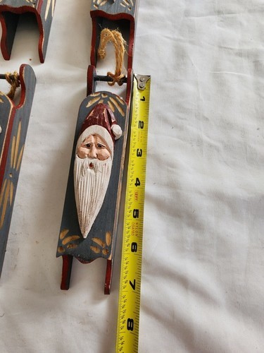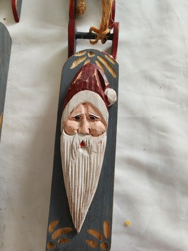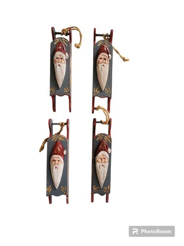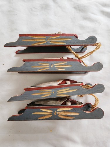 Vintage Primitive Wooden Sleigh Xmas Ornament Santa Face Lot X 4