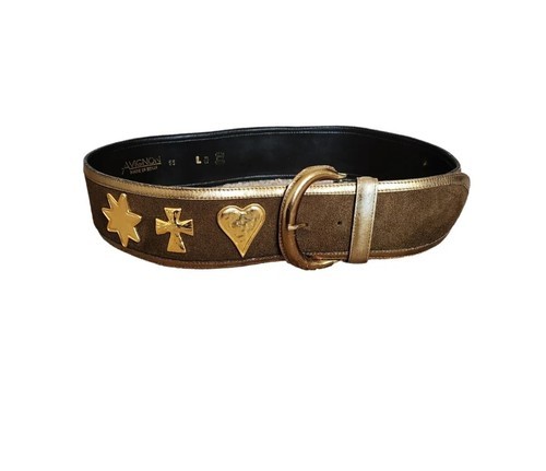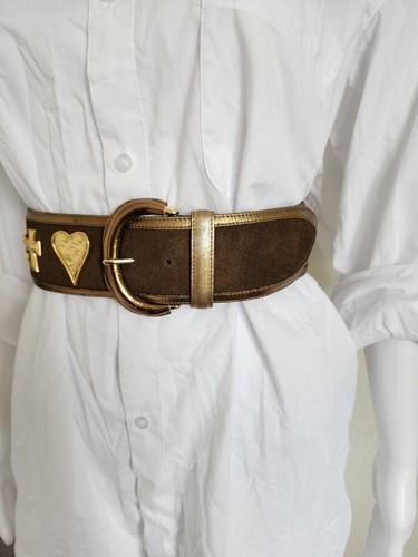 Vintage 80-90s Avignon Wide Suede Belt Gold Heart, Cross Charm Accents belt L