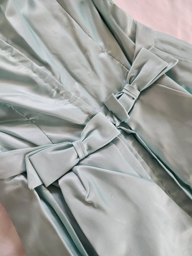 Fitted bodice with short sleeve. Flared skirt rear site has two bows. No pockets.