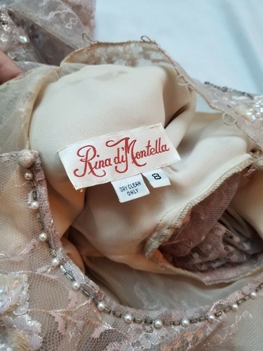 Rina Di Montella vintage silk dress. Beautiful lace bodice and sleeves. Victorian neckline fastens in back with buttons. Long sleeves button at wrists. Lace is embellished with rhinestones and pearls.