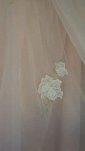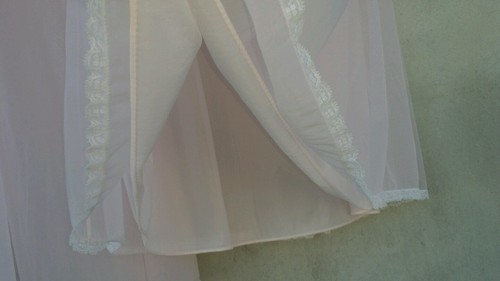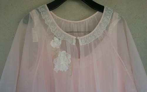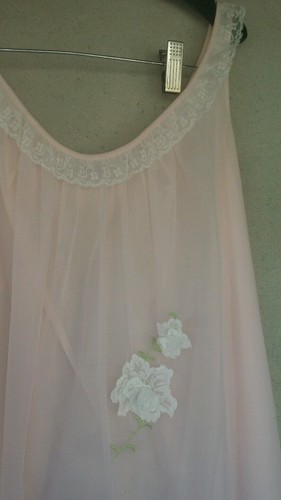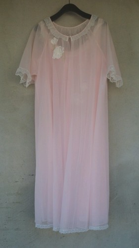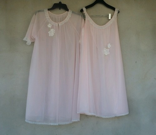 This vintage "gown" just exquisite, romantic and makes you feel like a princess. Very light Nylon, almost like air/feather, silky on touch and sheer. Both items adorned with 3D like flower applique, both have lace all over the hem, neck and sleeves area. Robe has only one button as fastening, works well and attached. Robe is double layered with same nylon fabric which makes any movement very sensual and flowing. No pockets and short sleeved, length somewhere above or right knee area.