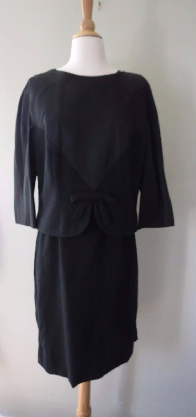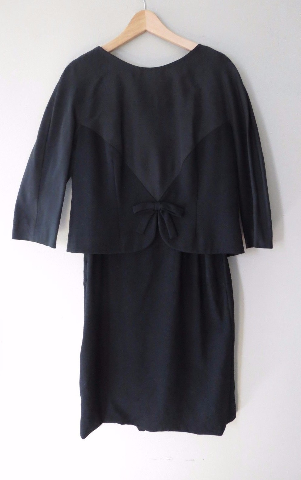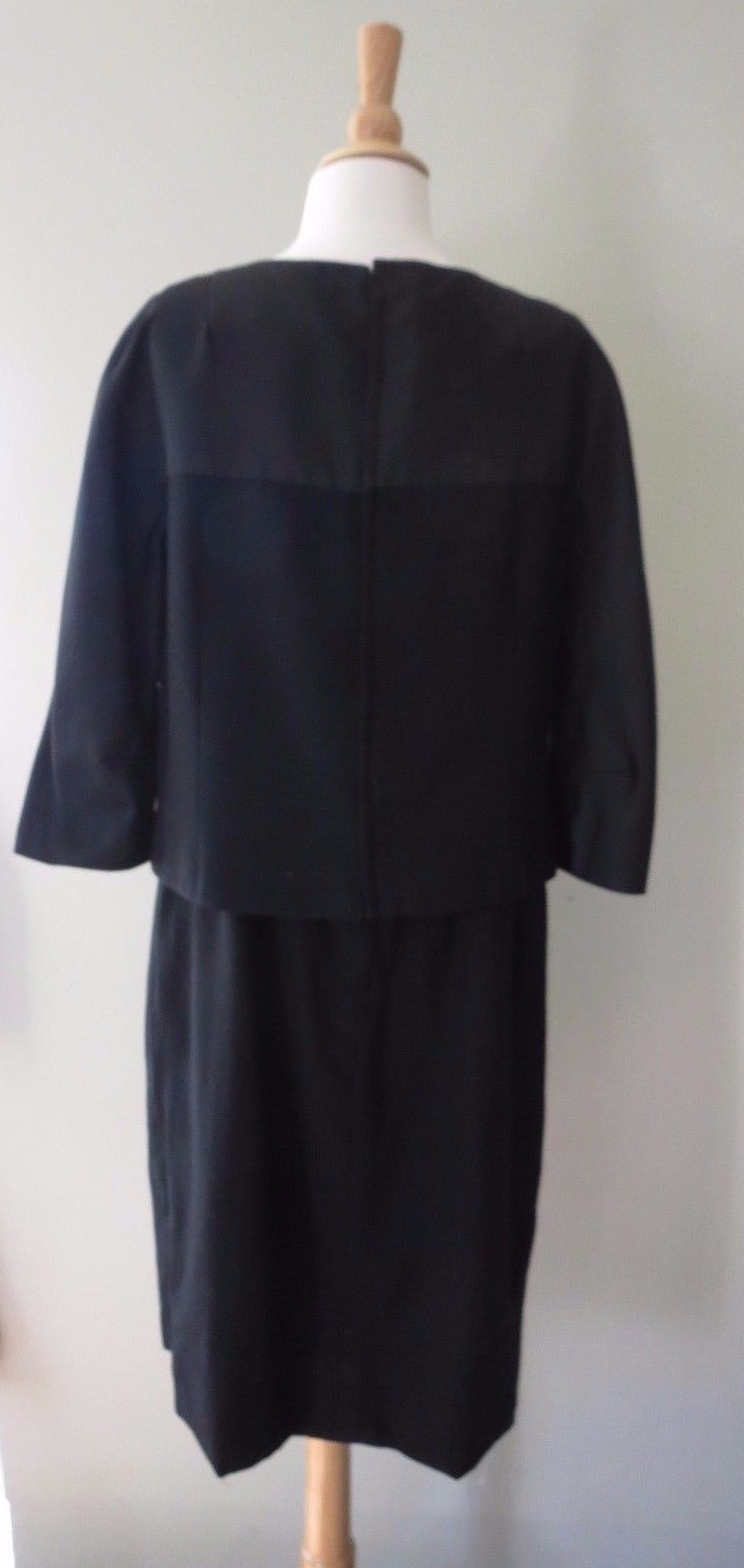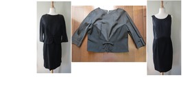 Despite being all black, this late 1950 -early 1960s dress suit makes quite an impact. A simple short black jacket tops a black wool dress that has killer curves. Jacket is made of a wool with silk topping lined in matching silk crepe. Closes at the back with a zipper and small hook eye. Dress is made of both the black wool flannel bottom and thin silk like top.Also zippered back and fully line skirt.