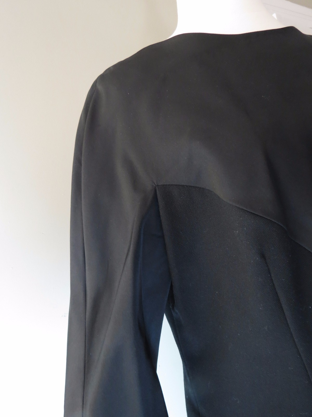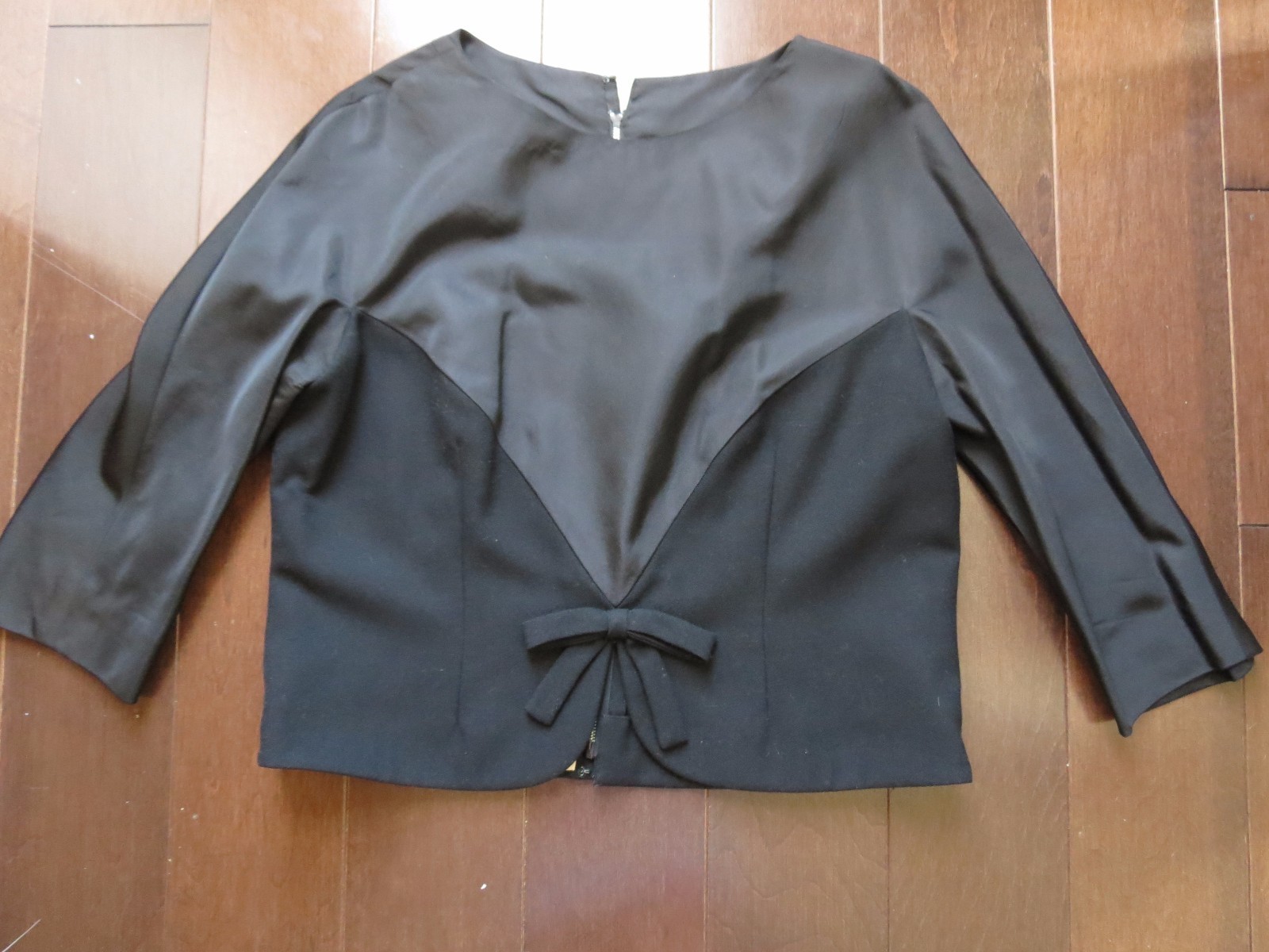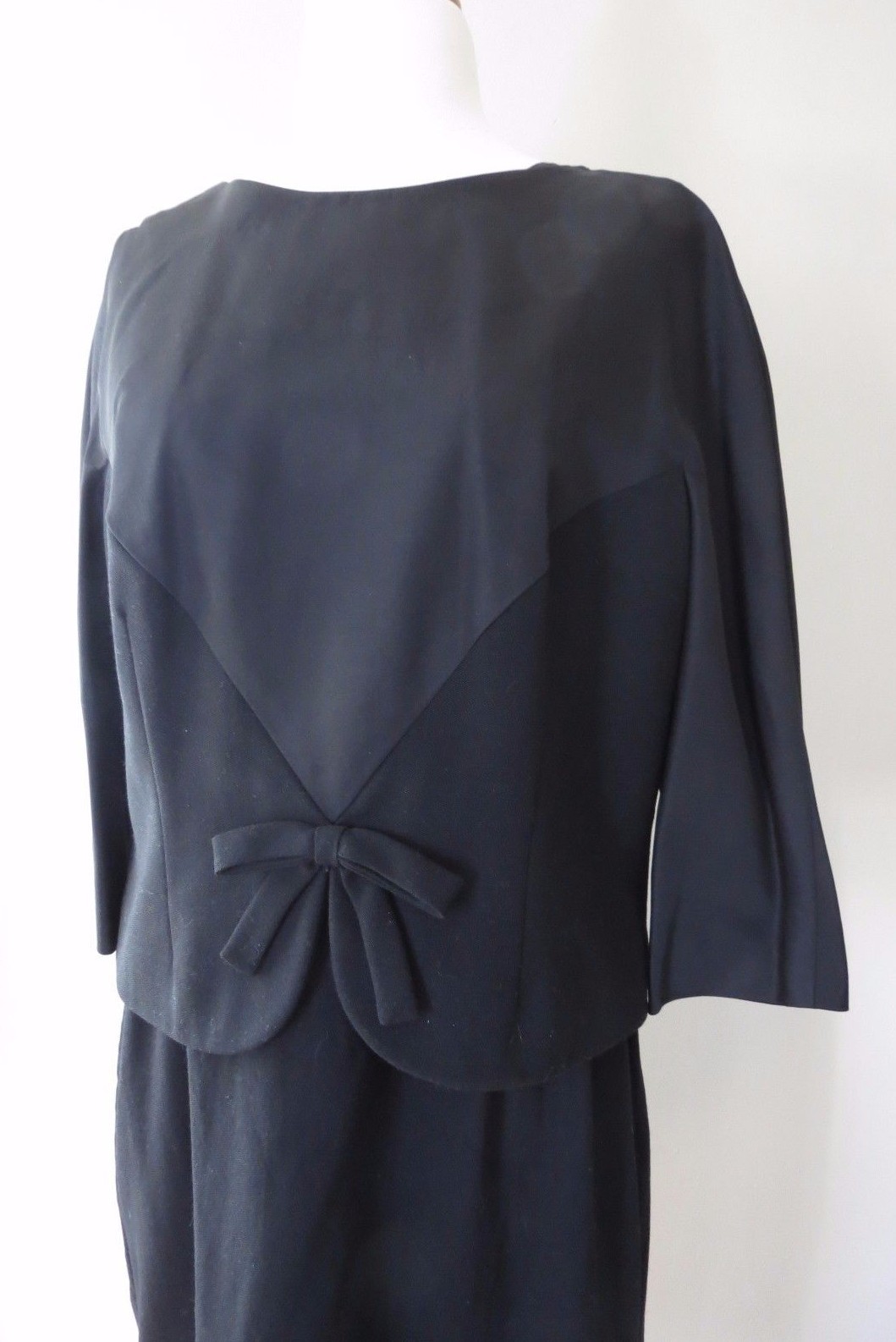 Despite being all black, this late 1950 -early 1960s dress suit makes quite an impact. A simple short black jacket tops a black wool dress that has killer curves. Jacket is made of a wool with silk topping lined in matching silk crepe. Closes at the back with a zipper and small hook eye. Dress is made of both the black wool flannel bottom and thin silk like top.Also zippered back and fully line skirt.