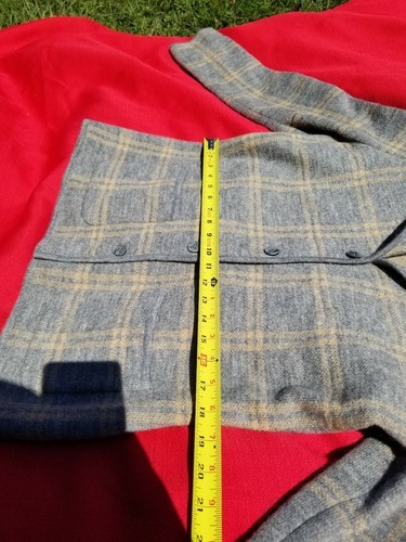 Button up front. Two patch pockets. Gray color with yellow plaid.