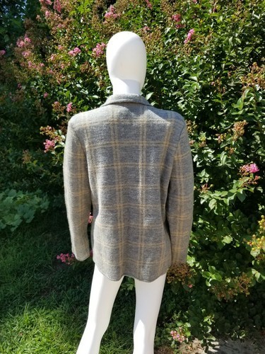 Vintage Rena Rowan Wool Cardigan Jacket Gray Yellow Plaid Small