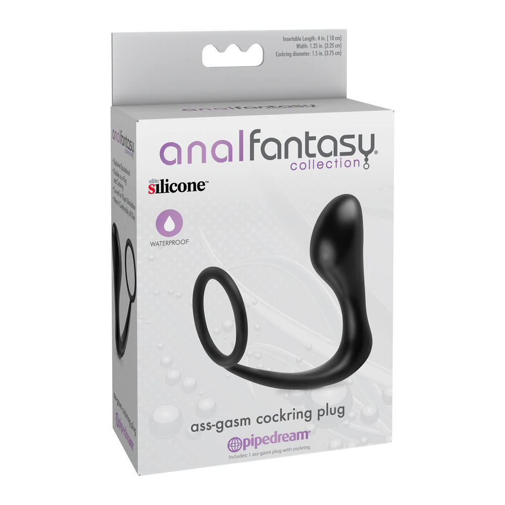 Enjoy the most explosive ejaculations ever with the Ass-Gasm Cockring Plug. Made entirely from our silky-smooth Elite Silicone, this wearable plug doubles as a performance-enhancing cockring, allowing the wearer to prolong ejaculation and extend the fun while enjoying incredible prostate stimulation. With the Ass-Gasm in your ass and the ring wrapped snug around your cock, you'll stay harder and stronger than ever before! The super-stretchy silicone ring puts the squeeze on performance letdowns, maintaining firm erections that last and last! The round, smooth head makes entry and retrieval a snap, while the thin, tapered shaft ensures the plug will stay in place between your cheeks when the action heats up. Place the ring around the base of your cock and balls and wear it all day for long-lasting fun and huge, powerful ejaculations! Our ultra-hygienic Elite Silicone is phthalate-free, hypoallergenic, and can be worn all day for long-lasting fun. Cleanup is a snap after the fun with the included Refresh Toy Cleaner and warm water. Every Anal Fantasy box features a FREE 5-Piece Prep Kit to help you ease into comfort and clean up afterwards. The kit includes 2 finger sleeves, anal desensitizing cream, anal lube, and toy cleaner. Insertable length: 4 in. (10 cm) Width: 1.25 in. (3.25 cm) Cockring diameter: 1.5 in. (3.75 cm)