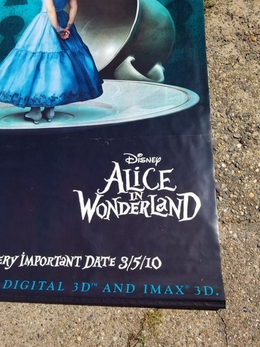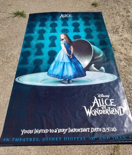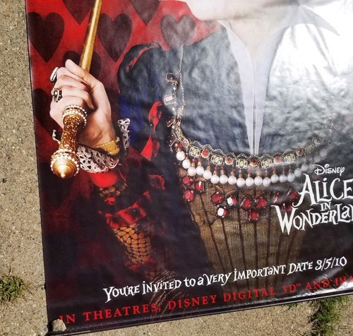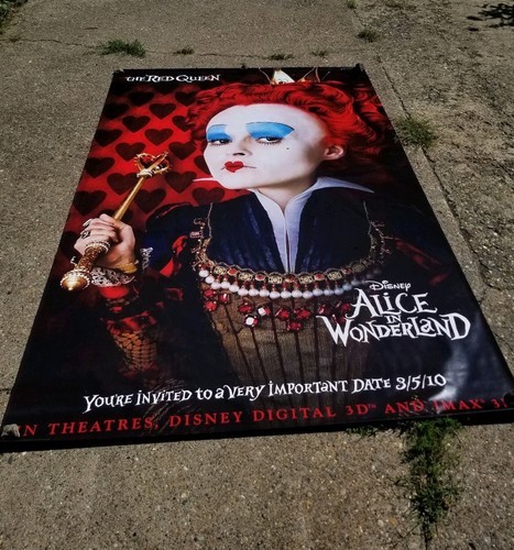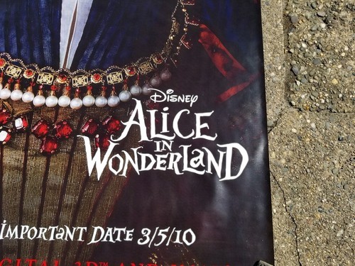 This is truly collectors piece with first time USA movie release of 2010 theatre double sided movie banner.Its has two sides with queen of heart on one side and Alice on the reverse side. Banner is made not from paper is flexible and rubber coated like. It will be shipped rolled up in tube packaging. Stars of this movie will include: Wasikowska, Helena Bonham Carter, Anne Hathaway, and Johnny Depp. This banner was specifically made as a promotional piece for IMAX movie theaters and was not available for sale in stores or general public.