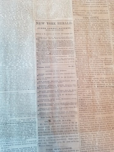 This is a unique scrapbook covers Civil war era topics. Newspaper clippings date range from 1861 July 30th- Aug 9th. Some newspaper clipping from New York Herald they cover various topics. Some include 68th NY regiment history. Newspaper accounts cover battles, historical figures.