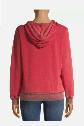 Lightly fleece lined. Super soft. Distressed like cuff sleeves and hemline. Hooded drawstring. No pockets.
