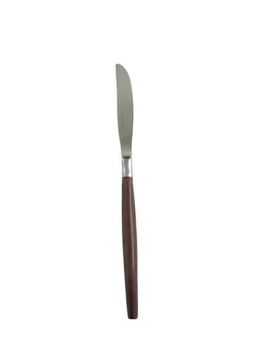 This dinner knife with a faux wood handle in good condition with light scratches consistent with normal wear and use. Never washed in a dishwasher.