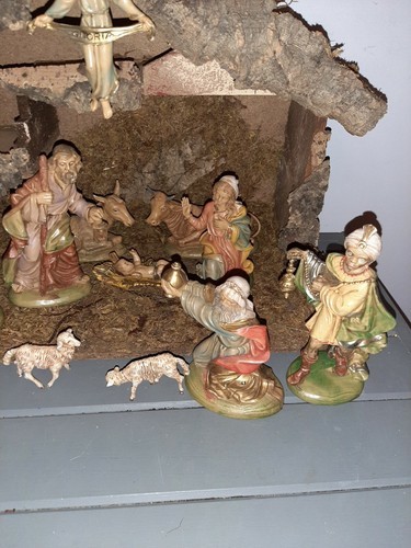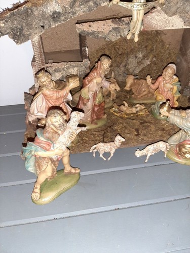 Sears Musical Nativity Set Christmas 12 piece Stable Creche Italy Silent Night. The tallest figure is 6.25 inches high. The creche is 14 inches tall, 19 inches long and 10 inches deep.