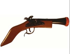 COLONIAL DOUBLE PERCUSSION CLASSIC WOODEN TOY PIRATE CAP FIRING PISTOL Material: Wooden stock, plastic orange barrel diecast metal action Approx. Measurement: 10" long Feature: Can fire single caps.