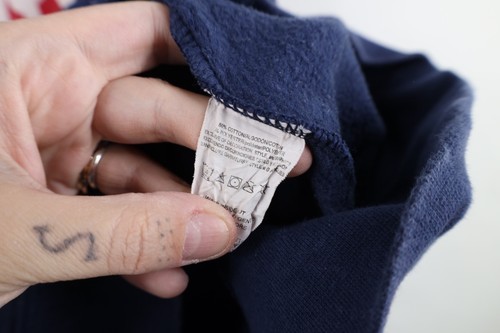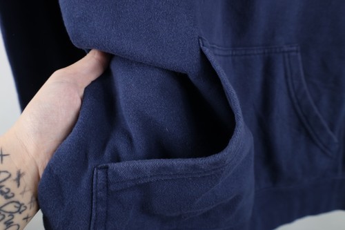 Hood, cuffs discolored. Graphics distressed, color faded. Dark spots/lines, pilling. String distressed