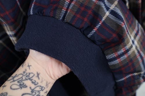 Collar, cuffs, bottom discolored/pilled. Color faded. Loose threads collar, cuffs