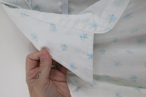 Stain on pocket. Collar, arms discolored. Yellowed. Pilling. Sheer fabric