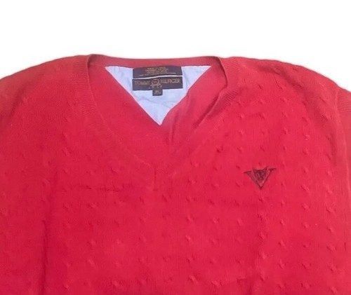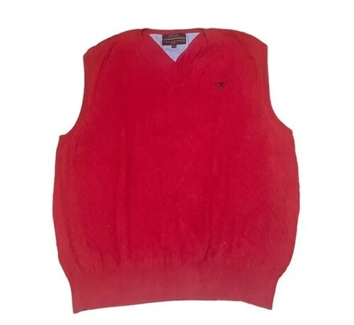Elevate your golf game with this stylish Tommy Hilfiger sweater vest for men. The classic red color and V-neck style create a timeless look, while the XL size ensures a comfortable fit. Made for golf, this vest offers the perfect balance of style and functionality. The breathable material will keep you cool during warm days on the course, and the high-quality construction guarantees durability.