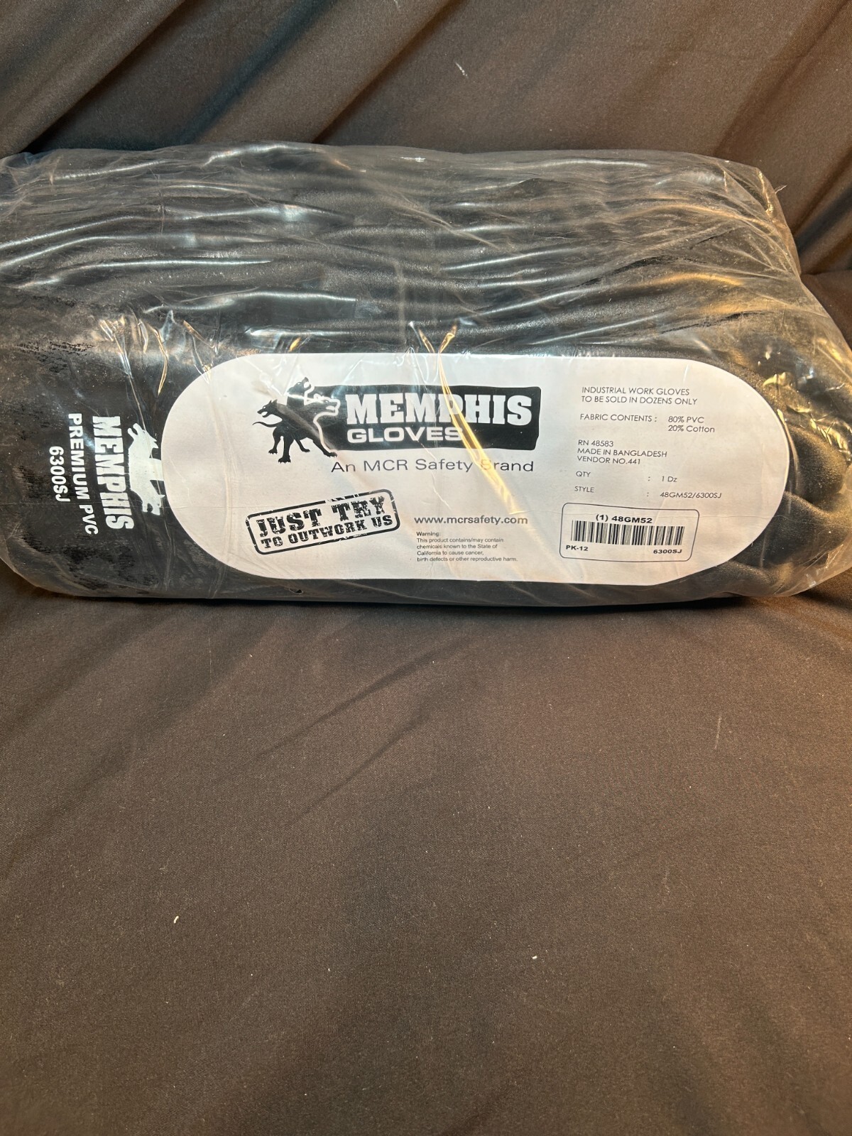 Stay protected with these Memphis Premium PVC MCR 14" Chem Resistant Gloves. The gloves are made of a cotton/polyester blend material with black PVC dots on the palm sides only (1 sided). They are great for gripping and holding items . These gloves are perfect for work gloves, hand protection, safety supplies, and facility maintenance safety. . There are a dozen gloves per package. Get your hands on these gloves today and stay protected while on the job.