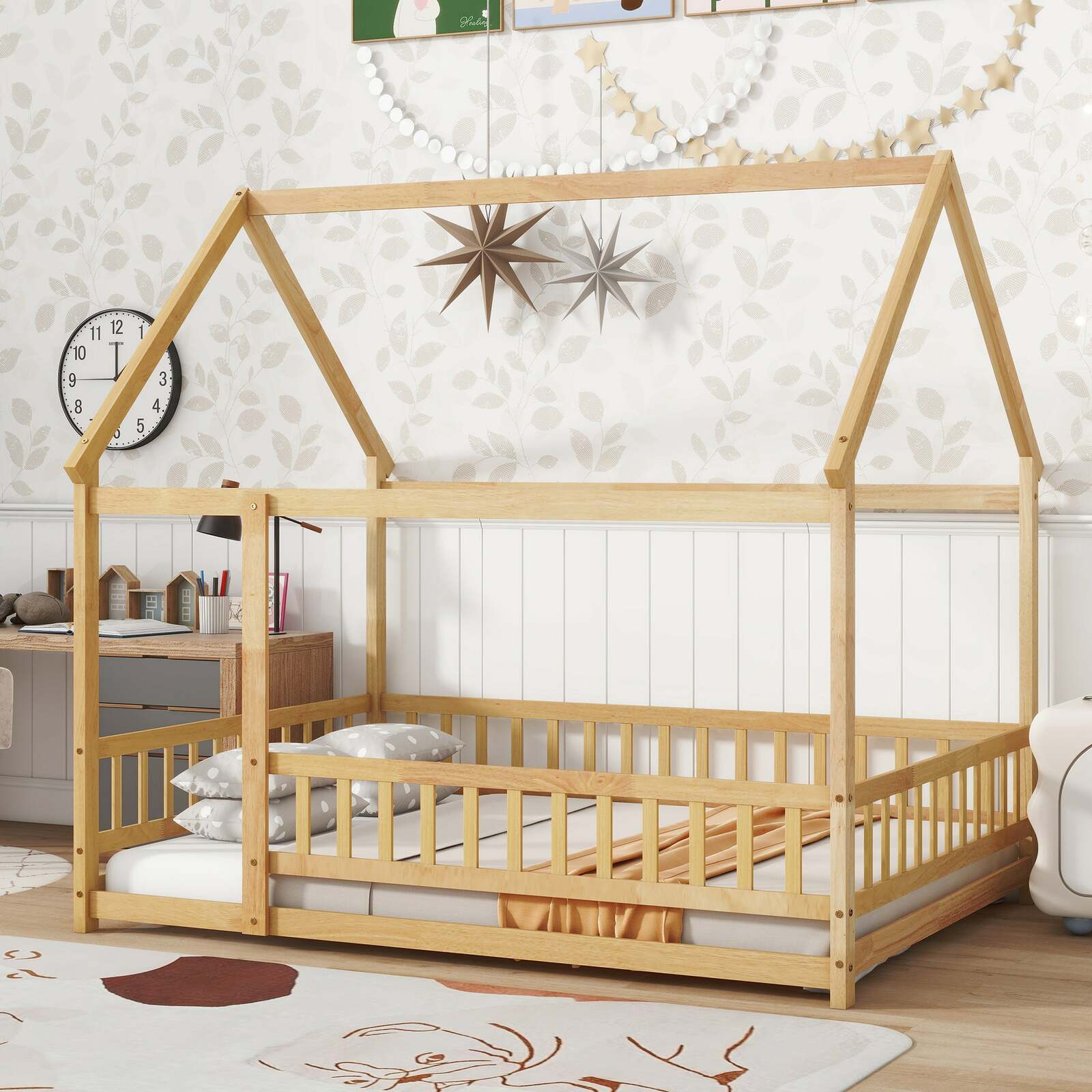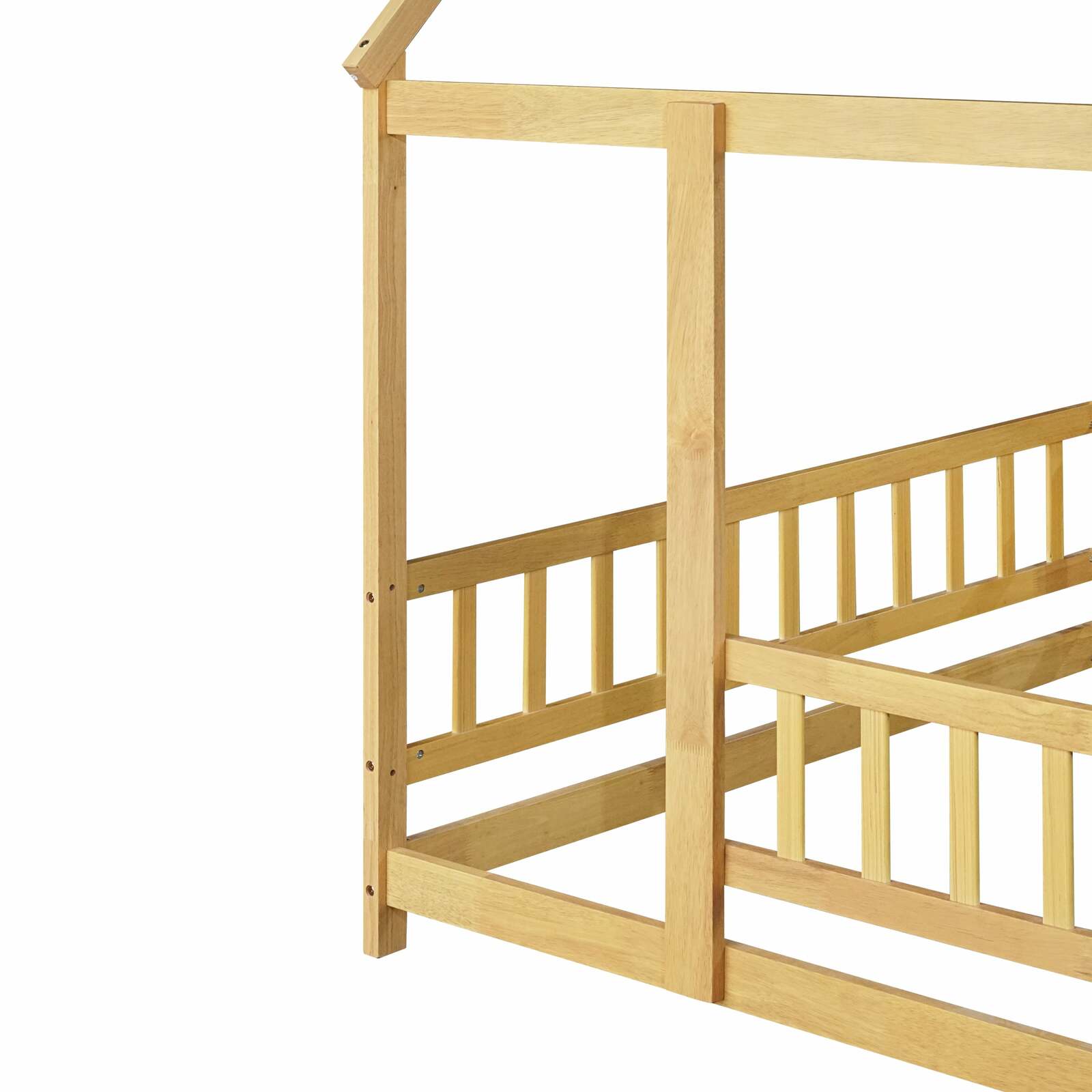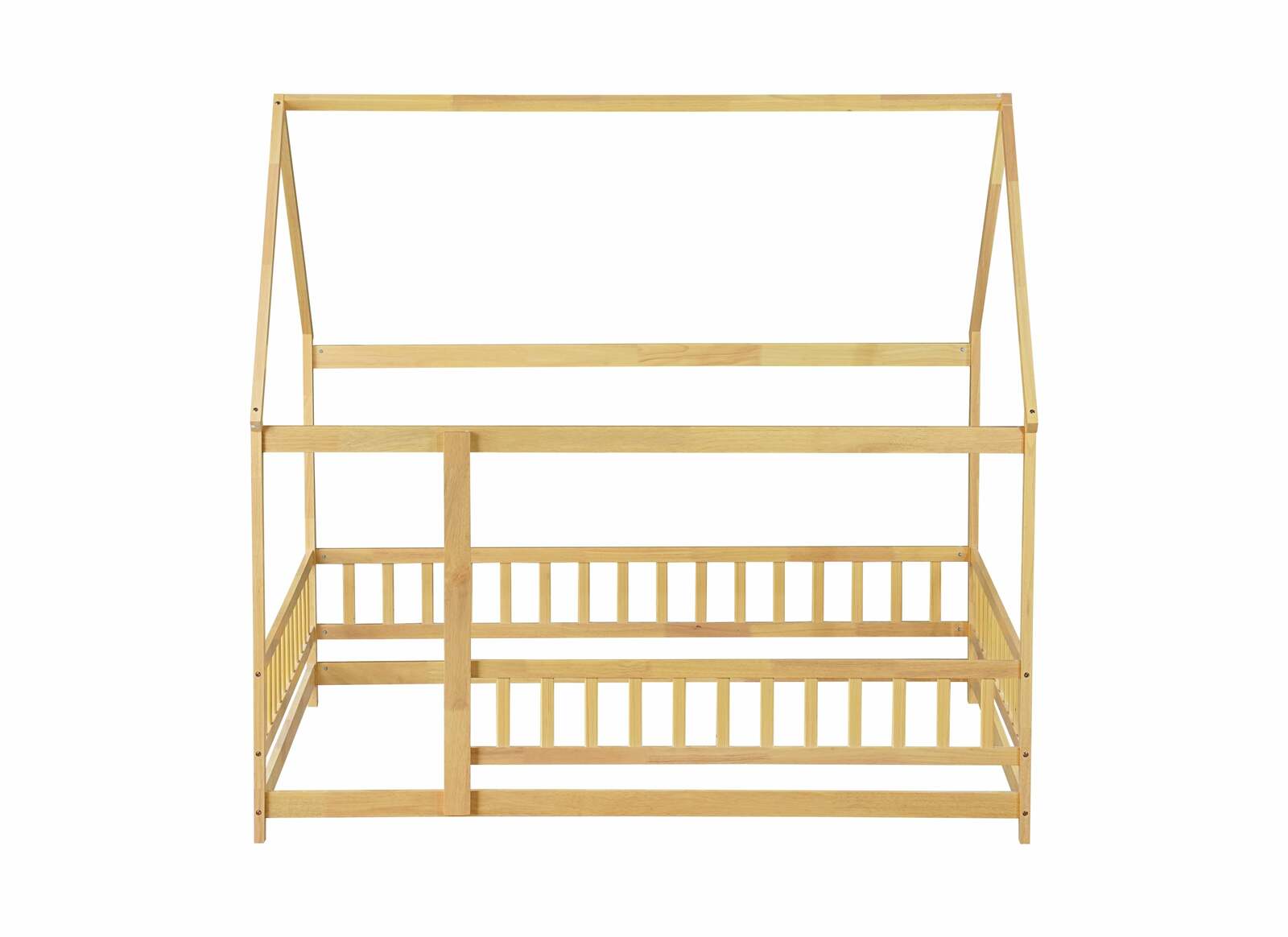 Full Size Wooden House Floor Bed w/ Roof & Guardrails, Natural