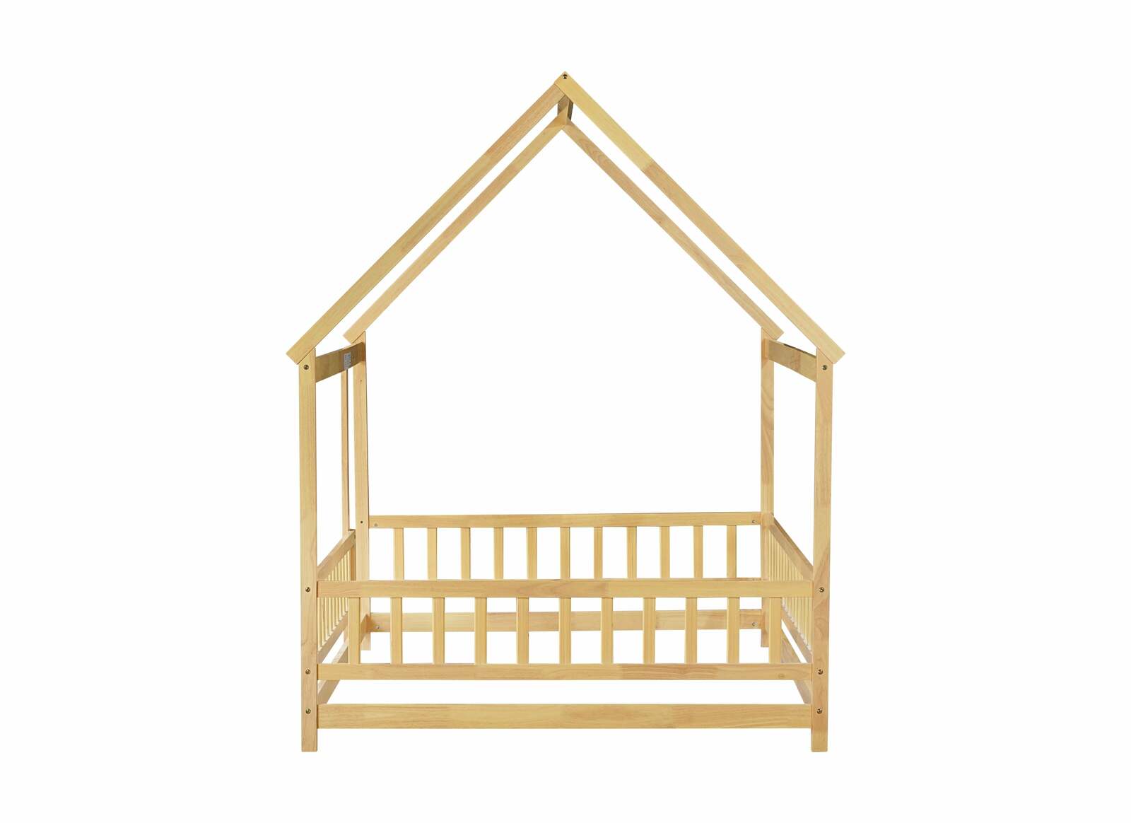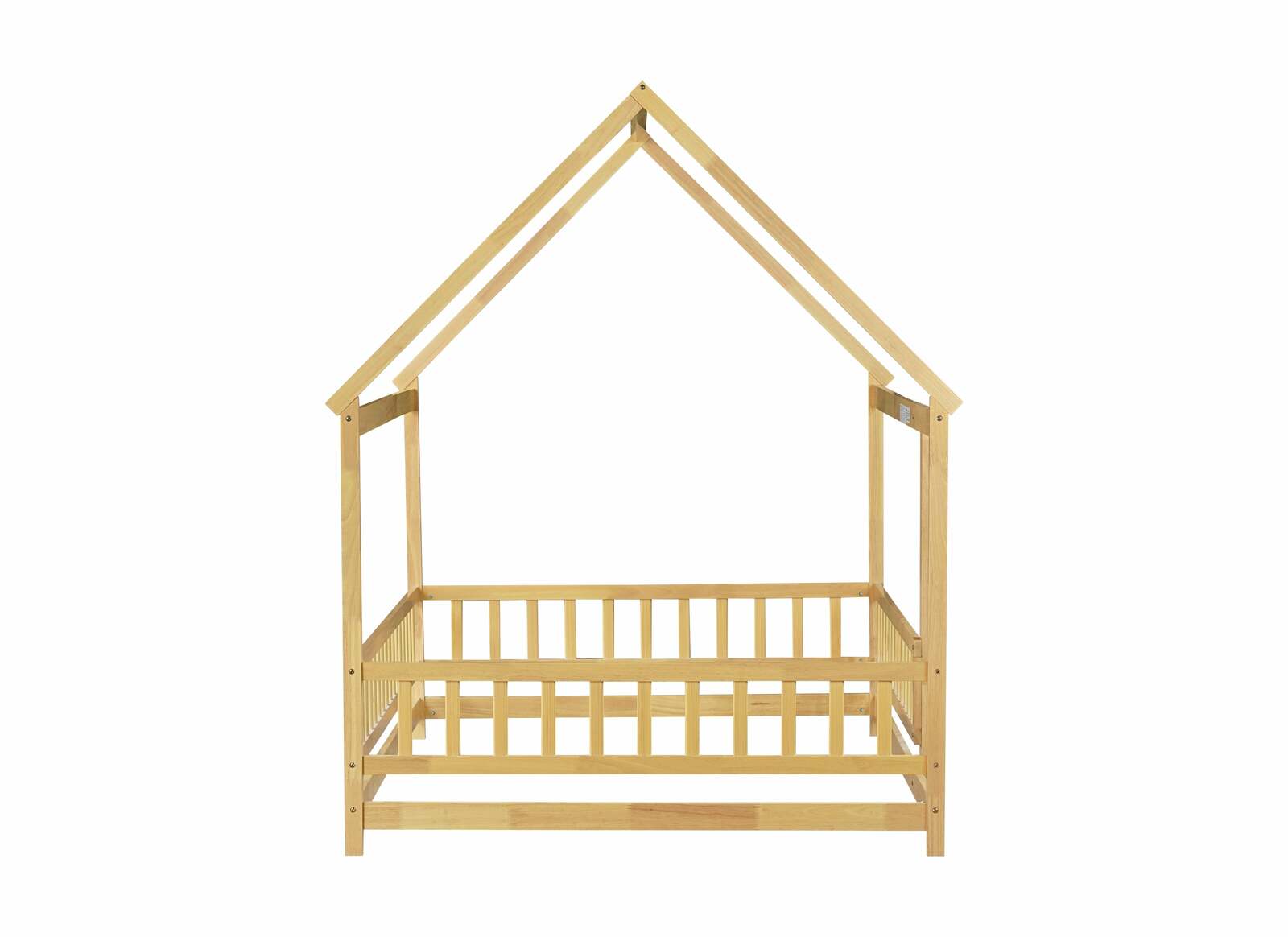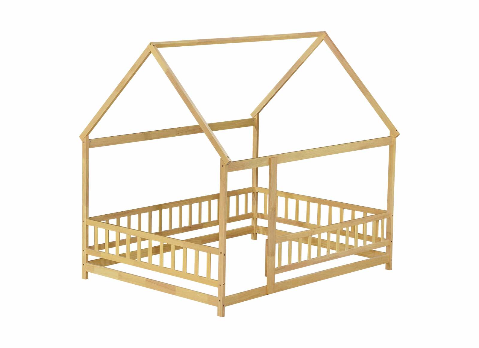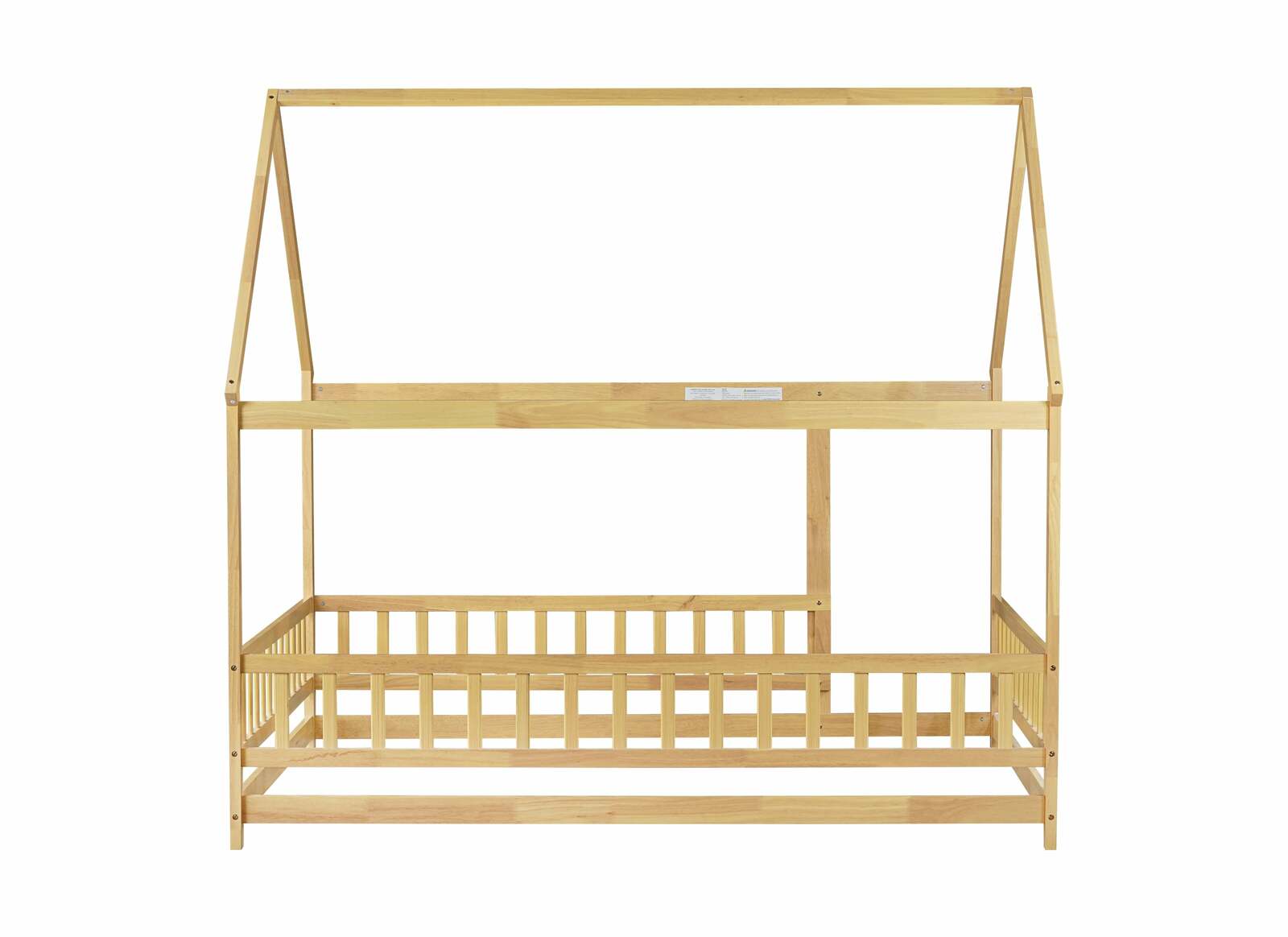 Full Size Wooden House Floor Bed w/ Roof & Guardrails, Natural