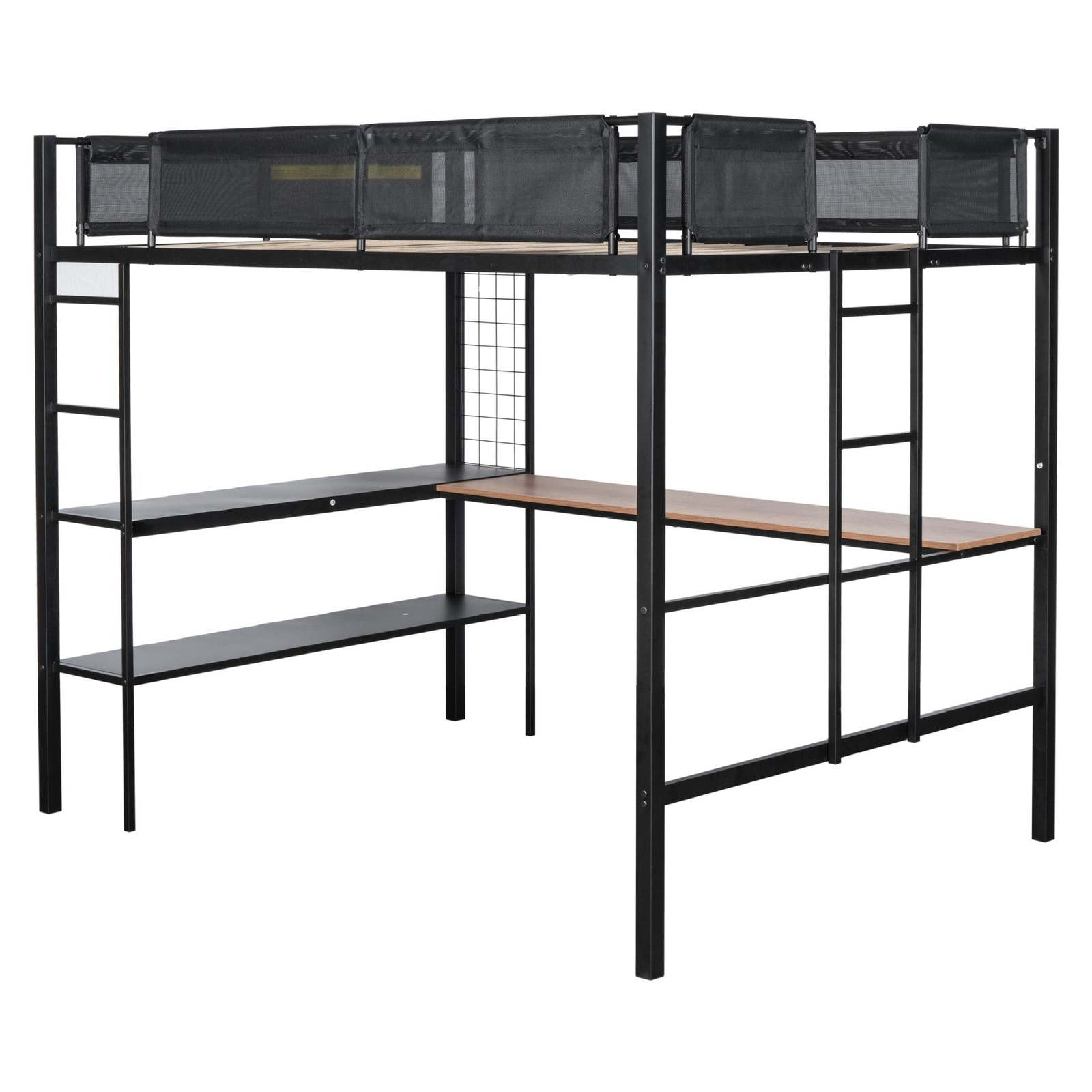 Metal Full-sized Loft Bed with Wood Slat, Textilene Guardrail Built-in Desk 2-tier Shelves
