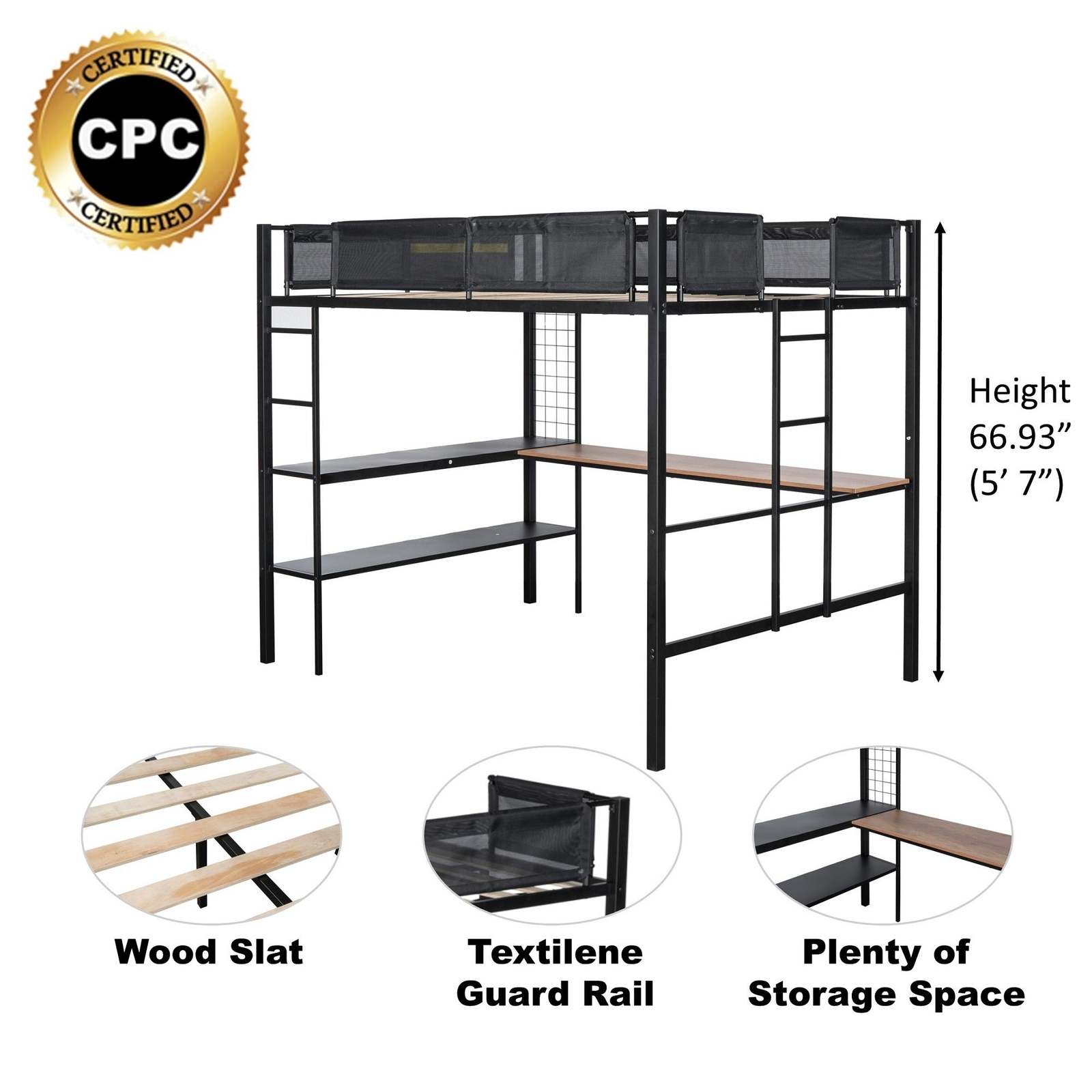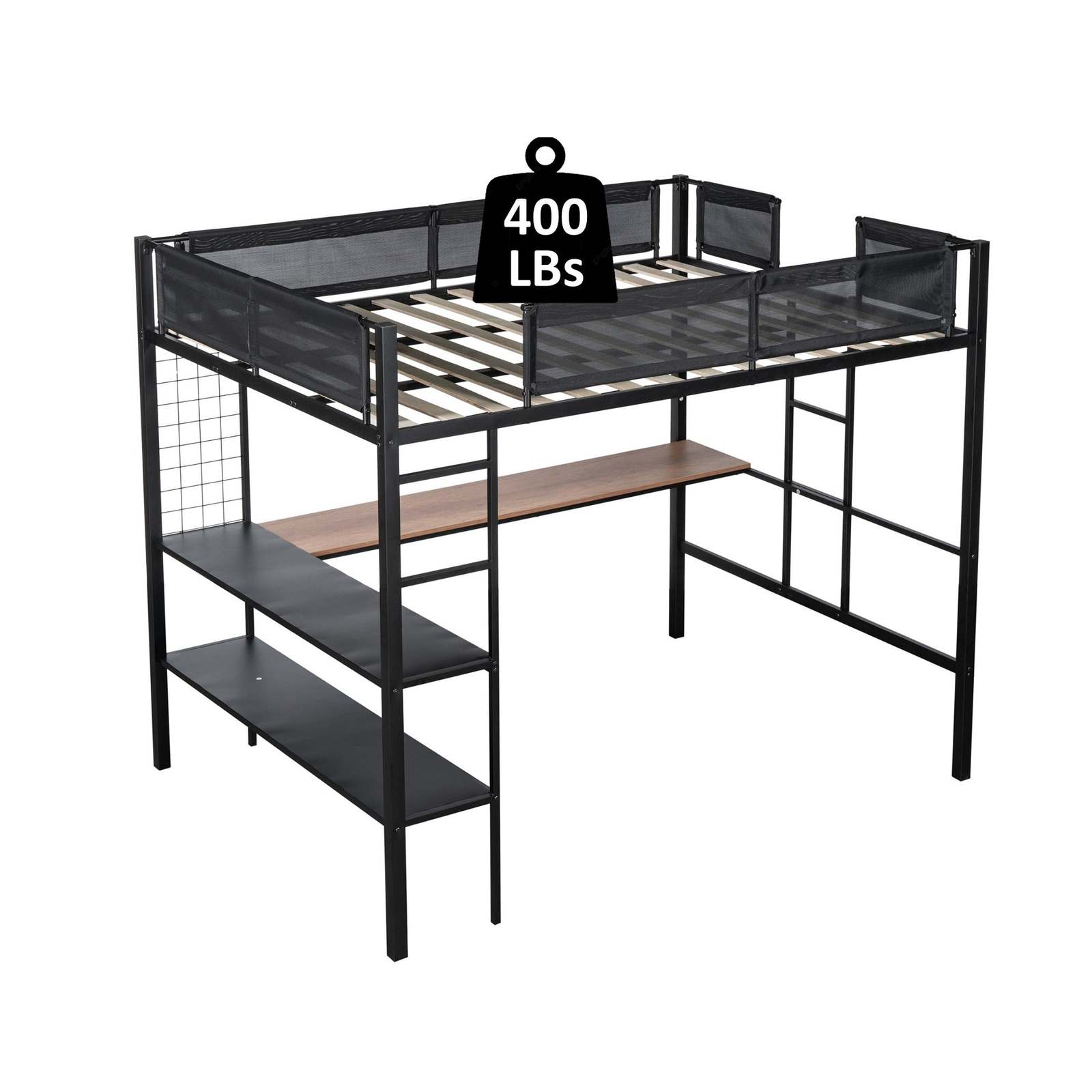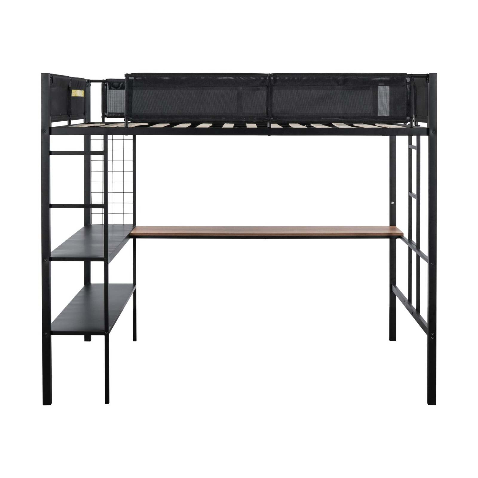 Crafted from robust metal, this loft bed exudes unmatched sturdiness, ensuring years of reliable use. Maximize your space effortlessly with its built-in desk, two-tier shelves and grid panel, providing a dedicated workspace and ample storage for your essentials. The quiet wood slat design guarantees optimal mattress support and also prevents the noise that ensures your comfort throughout the night. Safety is paramount, and our loft bed boasts a textilene fiber guardrail surrounding the sleeping area, offering a secure and peaceful sleep. Redefine your bedroom aesthetic with this functional and stylish loft bed that merges versatility and durability in one remarkable loft bed.