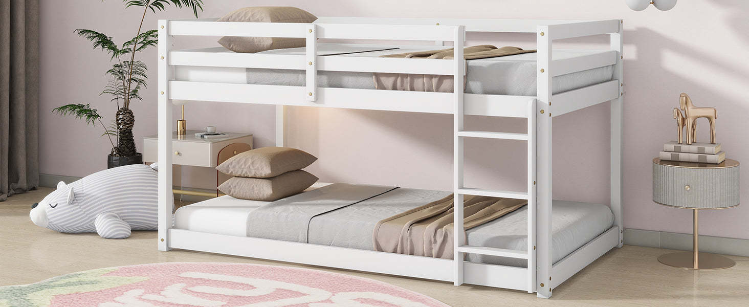 #1 [Twin over twin bed Design]The low height feature of this twin over twin floor bunk bed not only ensures better stability but also increases versatile utilization. The unique design offers diverse sleeping preference as well as optimizing storage space. The ladder is crafted with a wider width to provide more spacious steps and solid support, ensures a more convenient climbing up and down.