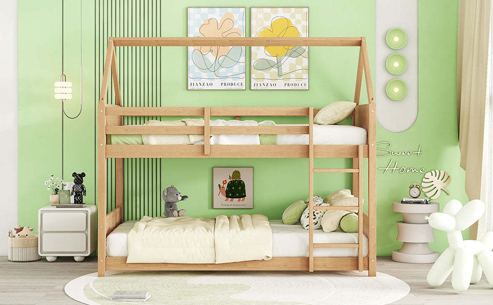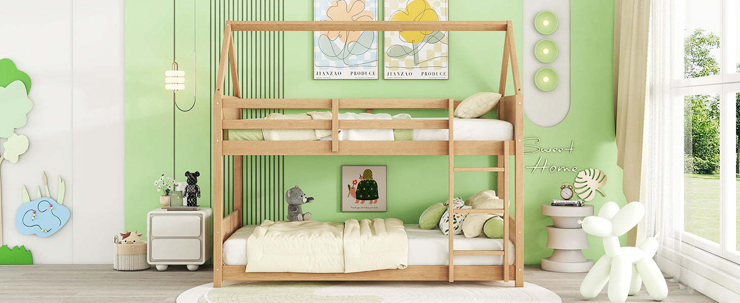 Twin Over Twin House Floor Bunk Bed with Headboards, Footboards and Guardrails, Ladder