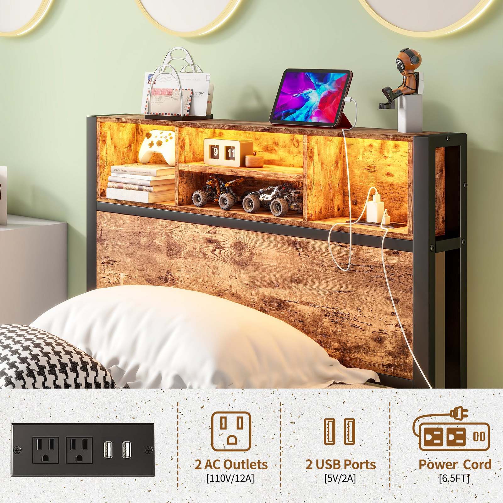 [ Storage Headboard with Charging Station ]: Built in 2 Standard Plug Outlets 2 USB Ports , Which is very convenient for you to charge your phones within easy reach or use a book light to read easily when you are lying on the bed. can be placed easily books, decorations, or some odds, providing you more storage space, It is very convenient and practical.
