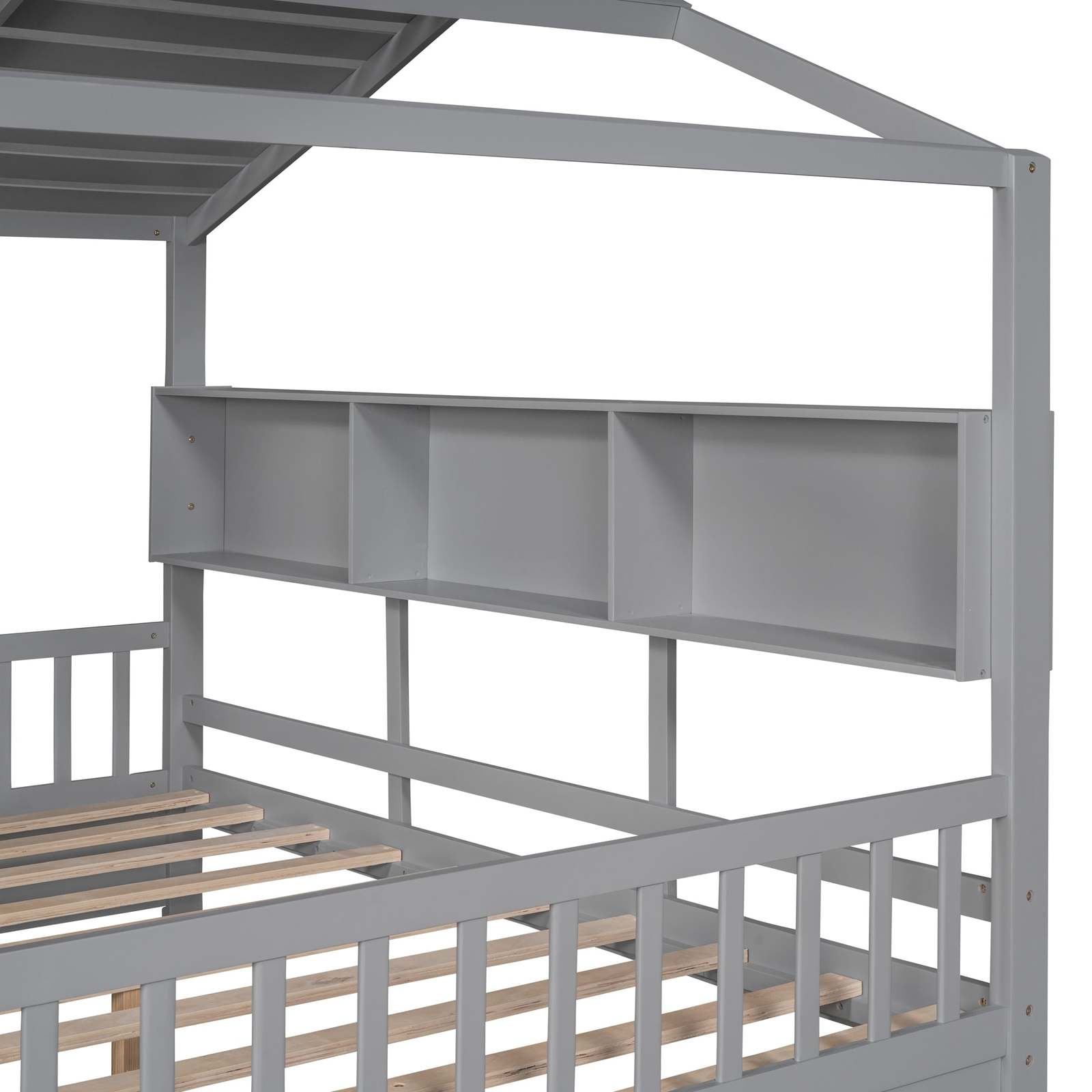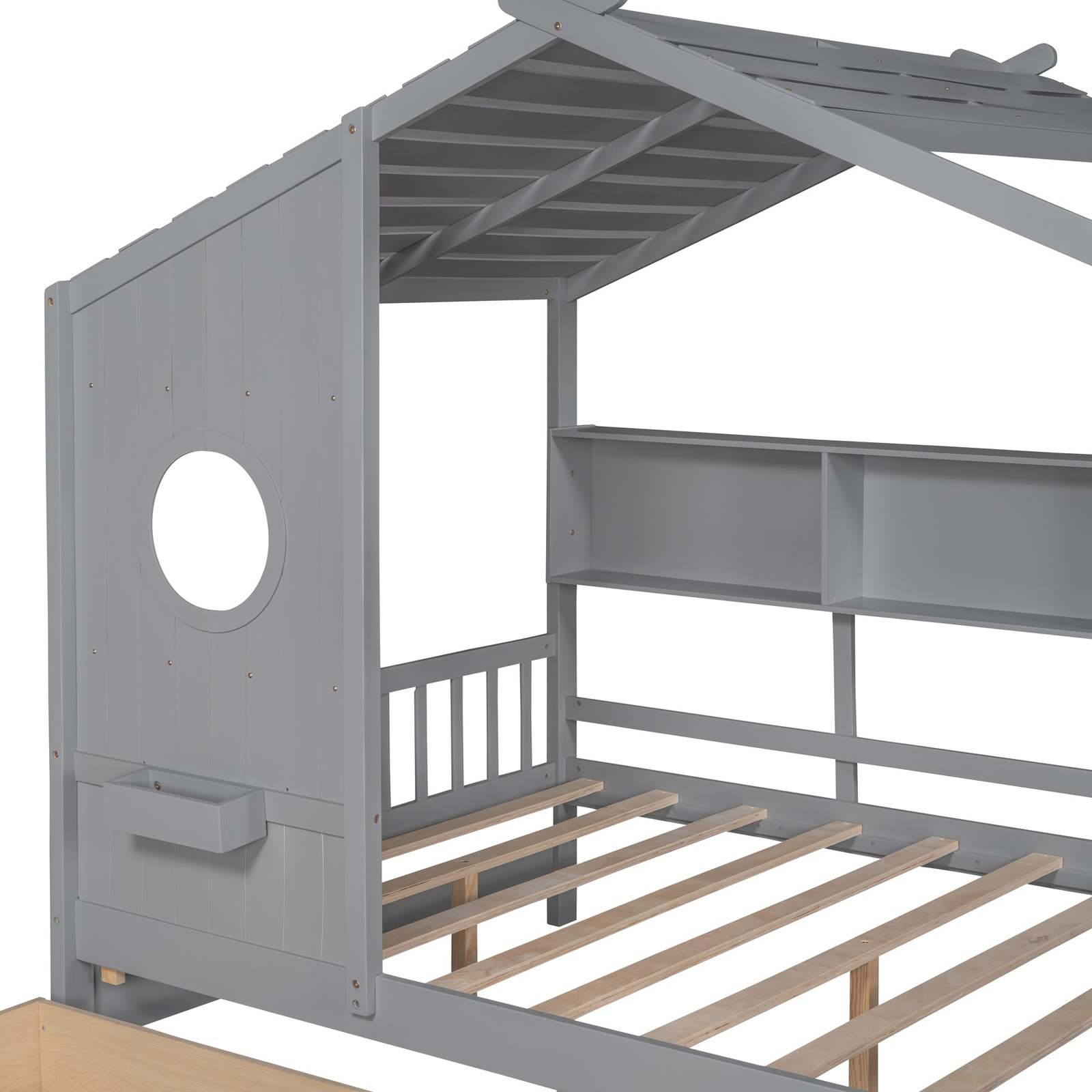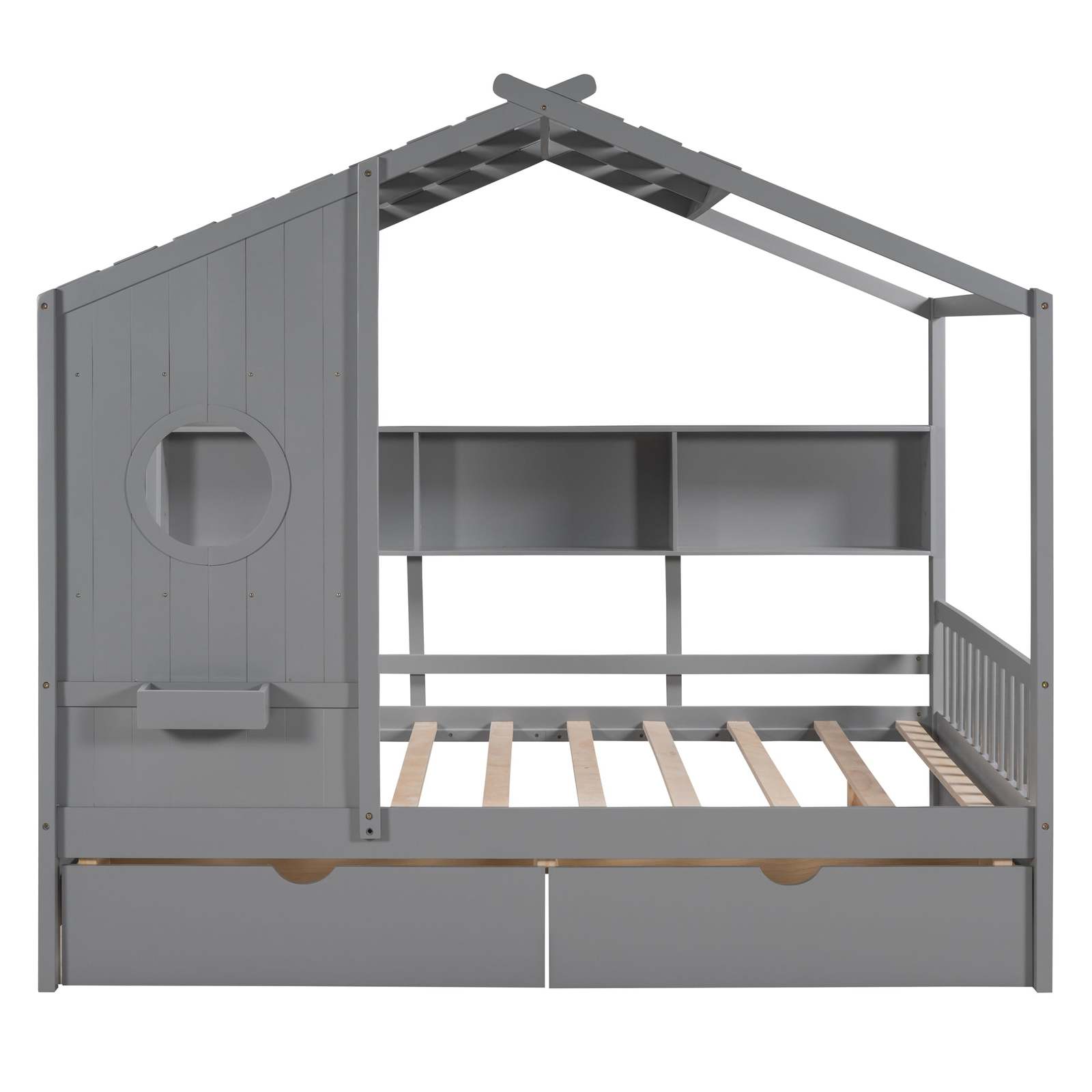 Gray Wooden Full Size House Bed w/ 2 Drawers & Storage Shelf for Kids
