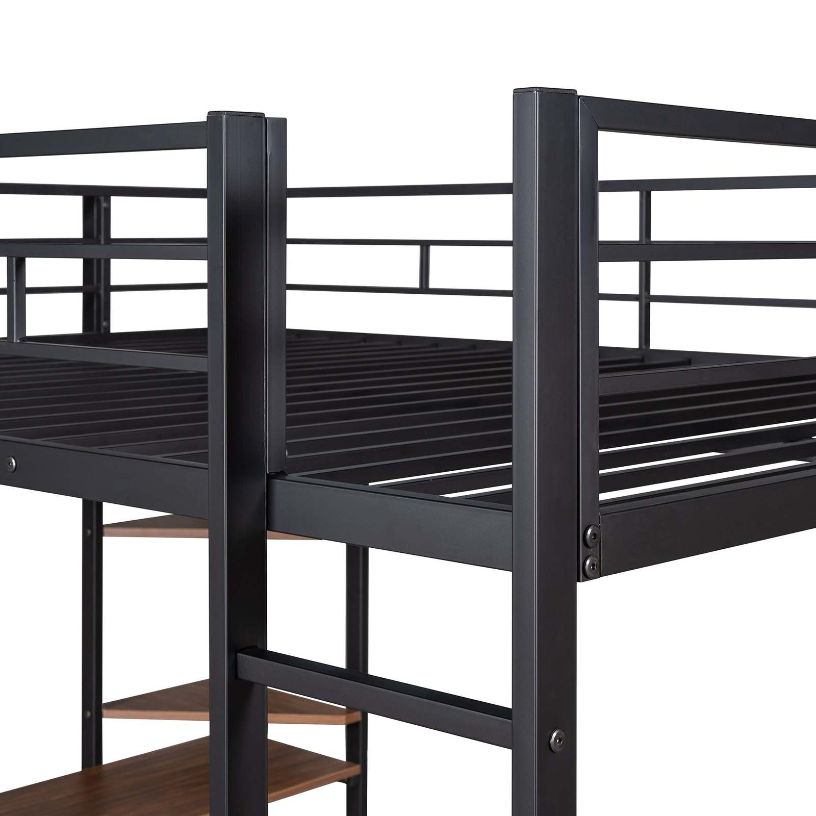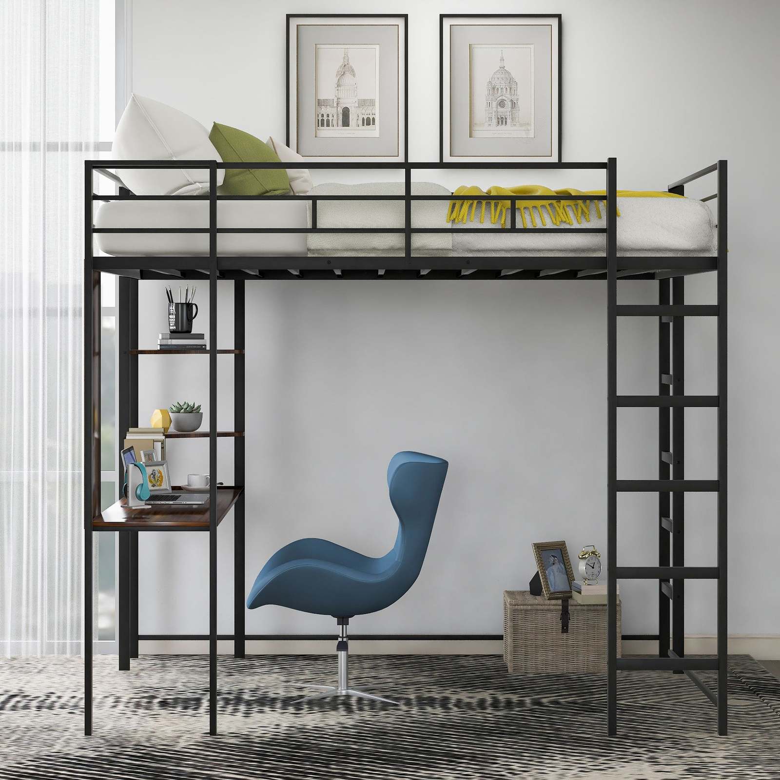 ?Space-saving solution. The loft bed includes a desk and two shelves integrated to the metal frame and has 59 of under-bed clearance.